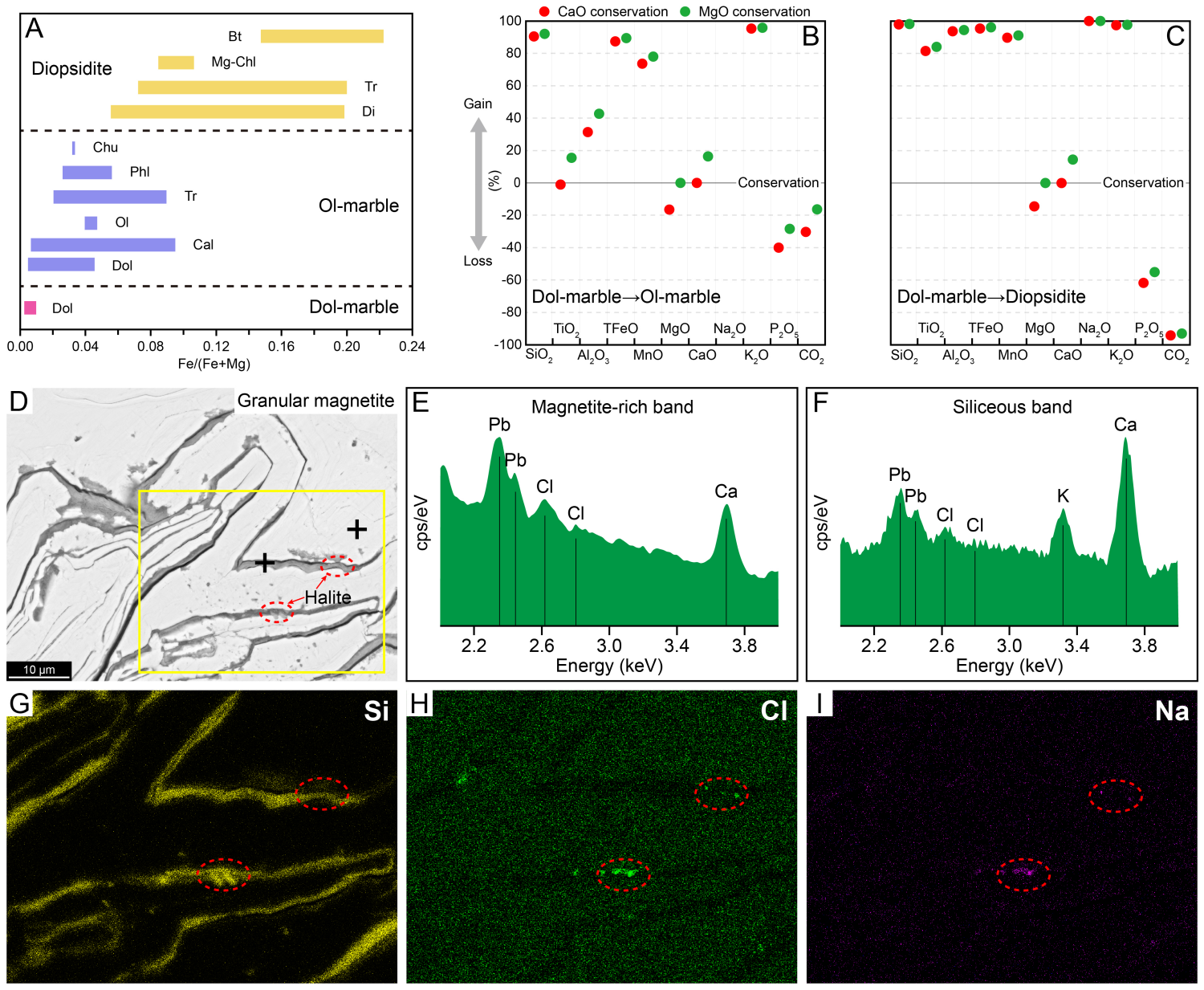 图3(A)各岩石中主要矿物的Fe/(Fe+Mg)比值;(B-C)交代过程中成分变化;(D−I)含Cl磁铁矿及富硅质韵律条带中的NaCl微晶