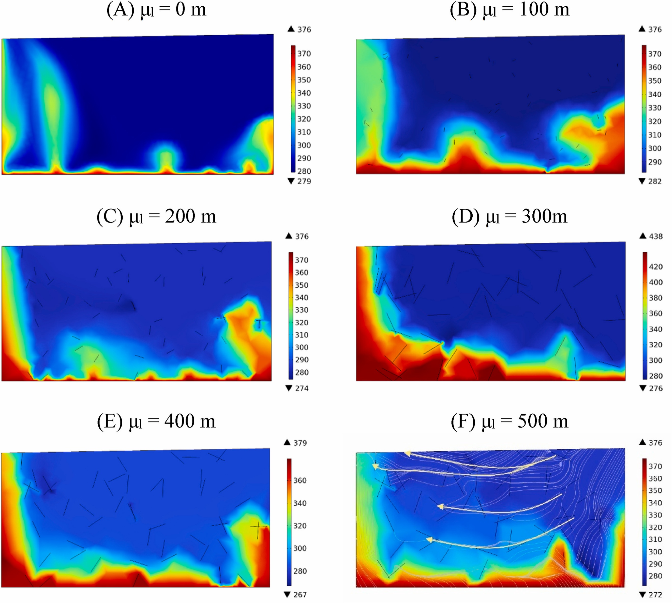 图1 数值模型及不同裂隙平均长度下的模拟结果。(A)裂隙平均长度为0,代表多孔介质模型;(B-F)裂隙平均长度分别为100、200、300、400和500米,其中(F)中的白色箭头指示了优势通道