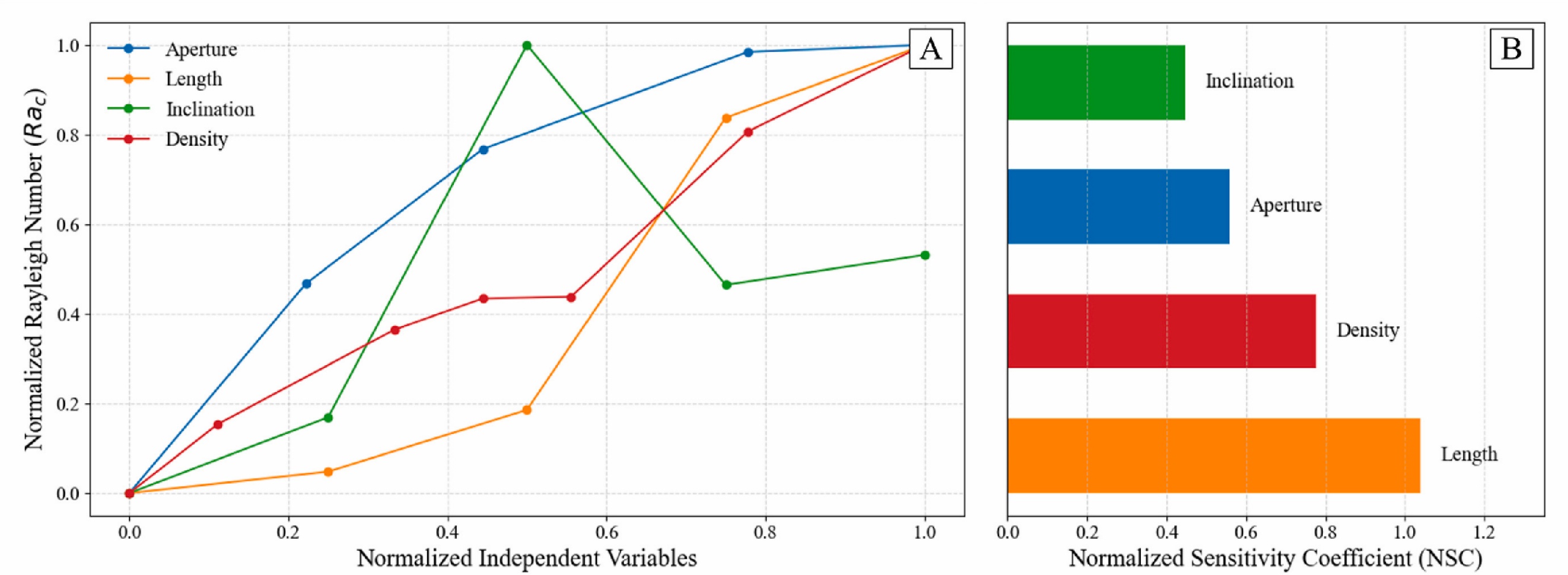 图2 敏感性分析。(A)临界Rayleigh数的标准化折线图;(B)局部敏感性分析