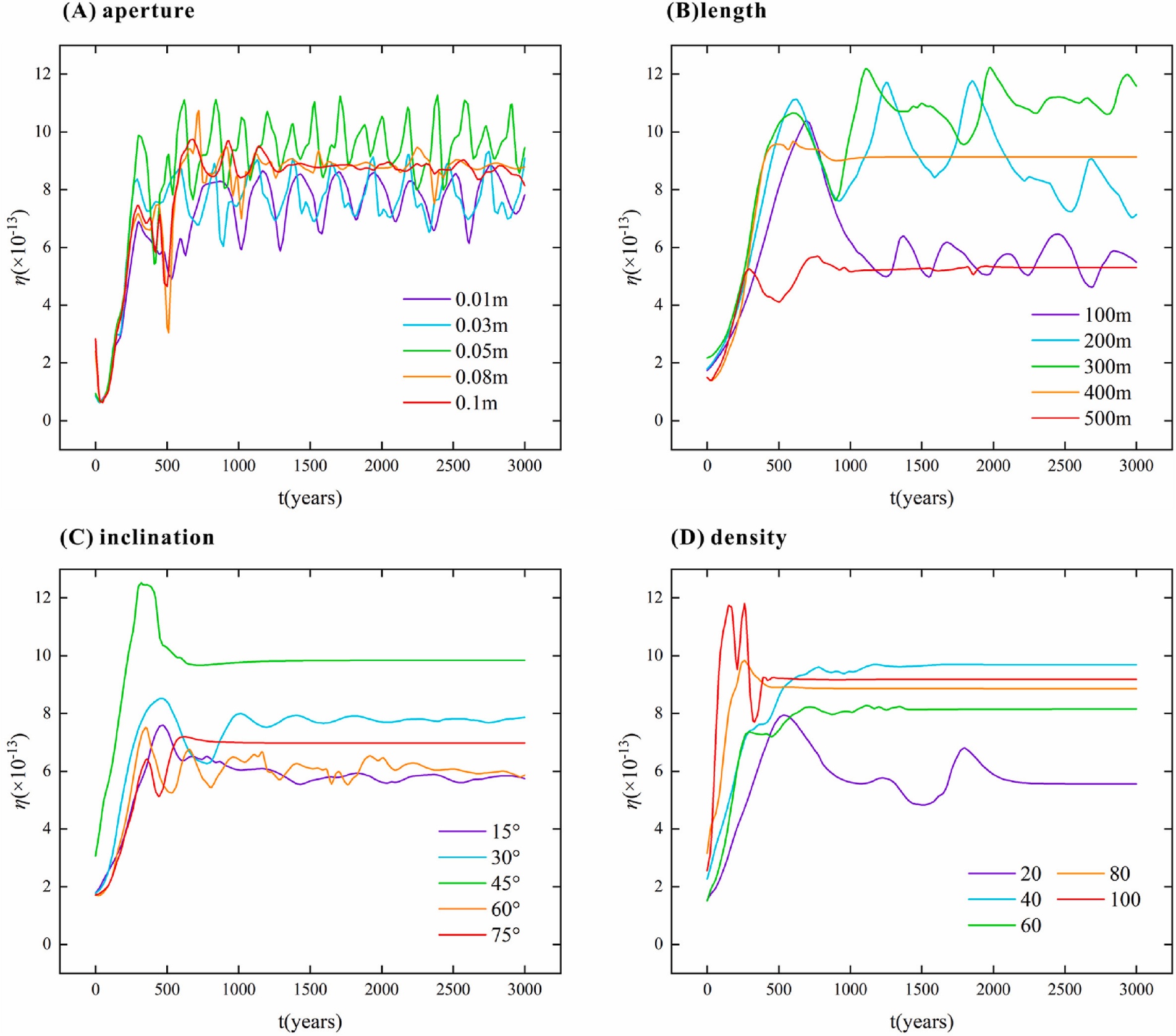 图3 不同裂隙几何特性对地热系统采热效率的影响。(A)开度;(B)长度;(C)倾角;(D)密度