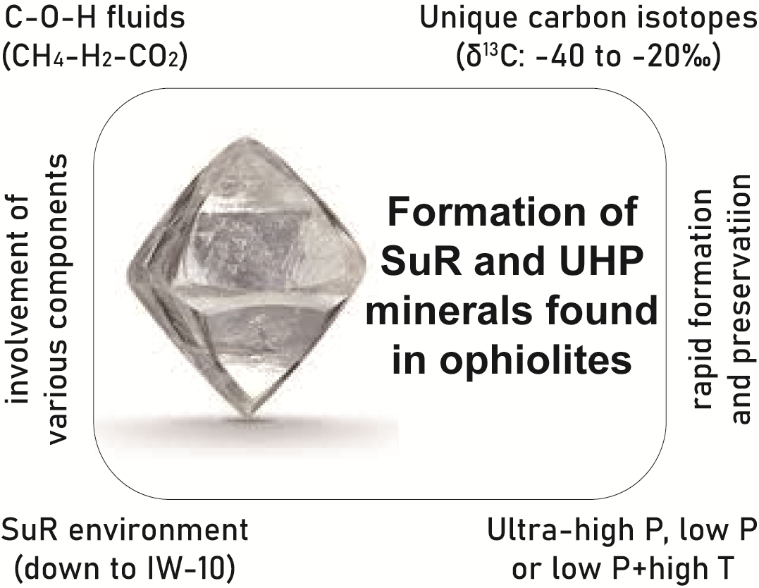 自上世纪七八十年代至今,地质学家陆续在全球20余个蛇绿岩中发现了极还原、超高压矿物(如金刚石、碳化硅、金属单质)等异常矿物,引起了学界广泛关注。这些异常矿物大多赋存在蛇绿岩的铬铁矿石中,在其橄榄岩中有一些产出,同时也在一些火山岩(如俄罗斯勘察加和以色列卡梅尔)有所发现,对蛇绿岩形成演化的传统认识提出了挑战。中国科学院地质与地球物理研究所苏本勋研究员与日本爱媛大学景揭俊博士后合作,梳理了蛇绿岩中异常矿物的发现历史,总结并评估了各种成因来源假说(图1)。