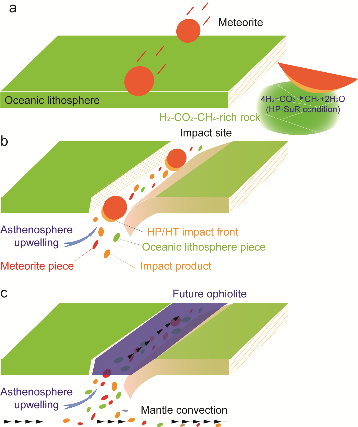 基于此,作者提出并论证了“天体撞击”作为一个能够调和上述矛盾的新假说。该模型认为,发生在古代大洋板块上的陨石撞击事件可以同时提供:1)瞬时超高压高温:撞击产生的冲击波可瞬间产生>10-100 GPa的压力和>3000 °C的高温,足以形成金刚石等超高压矿物;2)局部超还原环境:撞击汽化碳质陨石或地壳有机质/甲烷,产生CH4-H2为主的强还原性流体,形成SuR矿物所需的极低氧逸度条件(fO2 ≤ IW-8)(图3);3)内外源物质混合:撞击能剧烈地混合内源(地幔、洋壳)和外源(陨石本身)物质,解释了异常的同位素组成(如轻碳来源)和地壳矿物包裹体的存在;4)触发俯冲起始:巨大的撞击能量可能薄化岩石圈并触发俯冲作用,从而将撞击形成的矿物和混合物质纳入后来形成的蛇绿岩序列中(图4)。