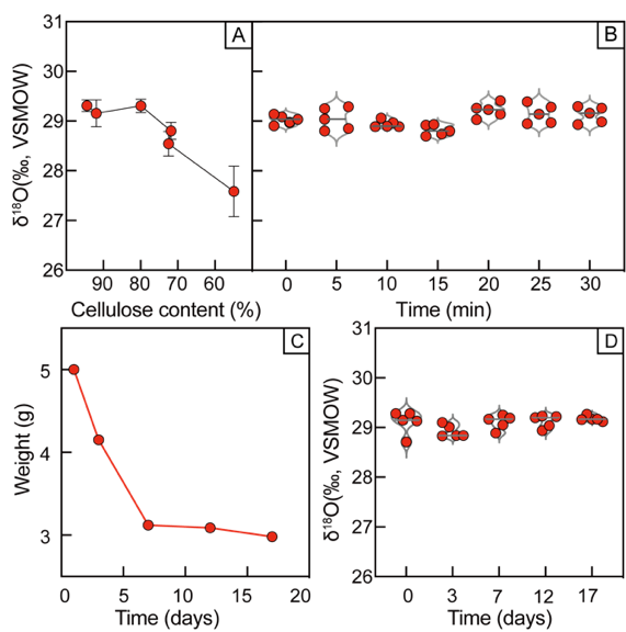 针对上述问题,中国科学院地质与地球物理研究所博士后任军博,在许晨曦研究员和郭正堂研究员的指导下,与上海交通大学环境科学与工程学院、中国林业科学院木材工业研究所、中国科学院微生物研究所和美国路易斯安那大学拉法叶分校的合作者们使用高纯度Merck 纤维素设计了水热和真菌降解处理实验,以模拟不同程度的成岩作用影响。结果显示,样品纤维素含量虽然随着降解有不同程度的减少,但其δ¹⁸O组成却几乎没有发生改变(图1)。这表明在温和成岩条件下,纤维素δ¹⁸O值具有较强的稳定性。
