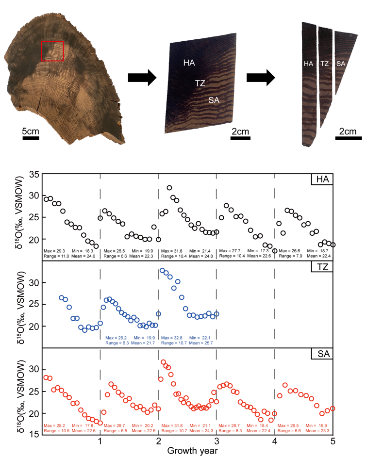 树木能够在年轮中记录下每年生长过程中的气候特征,是大自然的天然记录仪。树轮纤维素中的氧同位素(δ¹⁸O)能够高分辨率地记录降水、蒸发和大气环流等气候过程,因此不仅能用于分析深时气候变化的总体趋势,更能揭示深时季节性变化等精细的古气候信息。