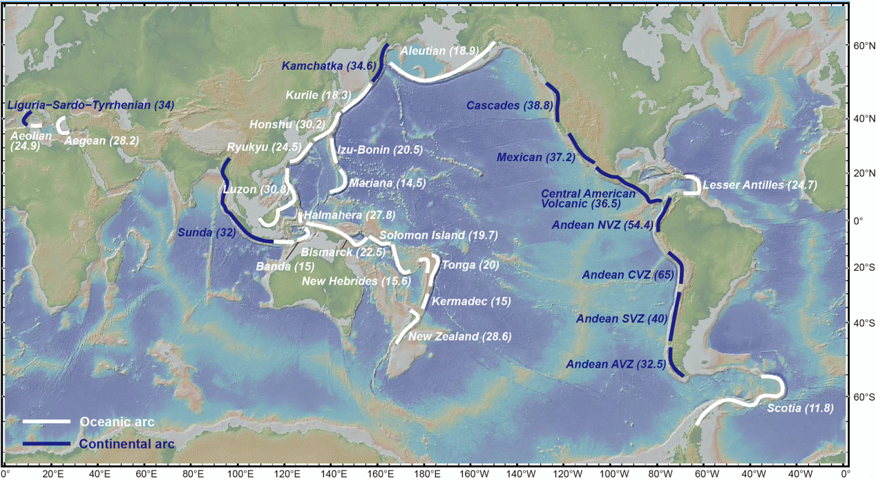 图1 包含29个新生代弧的位置的世界地形图,29条弧根据上覆地壳属性可分为大洋弧(白色)和大陆弧(蓝色)。括号中的数字表示每个弧的地壳厚度