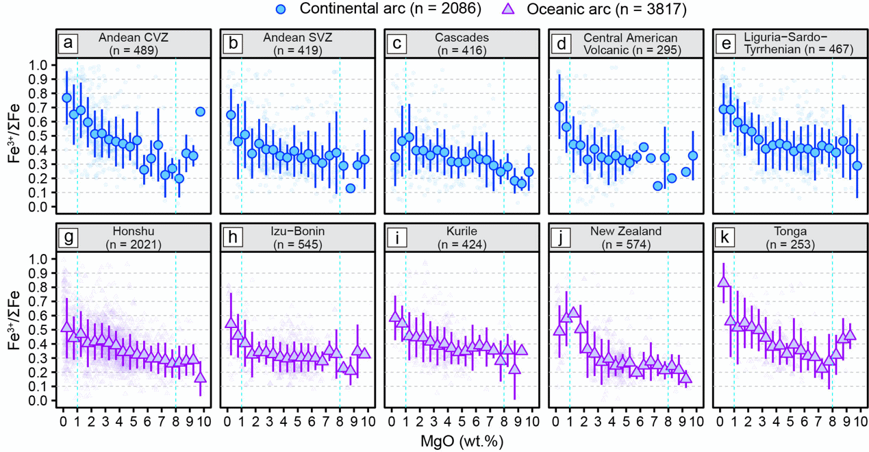 (1)弧原始岩浆(MgO > 8 wt.%)的平均氧逸度(Fe3+/ΣFe = 0.32 ± 0.01,1σ,n = 735)显著高于MORB(Fe3+/ΣFe = 0.10 ± 0.04,2σ)。这与弧岩浆中含有俯冲板片释放的氧化性物质(Fe3+、SO42-、H2O等)有关。