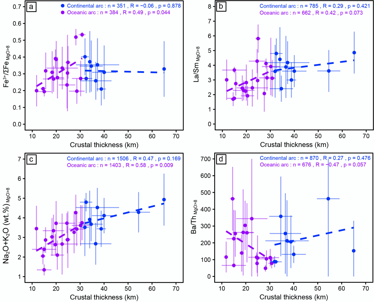 图3 大洋弧和大陆弧原始岩浆(MgO > 8 wt.%)的(a)Fe3+/ΣFe、(b)La/Sm、(c)Na2O + K2O 和(d)Ba/Th与地壳厚度关系散点图。每个实心圆代表单个弧的平均值。误差线代表一个标准偏差(1σ)