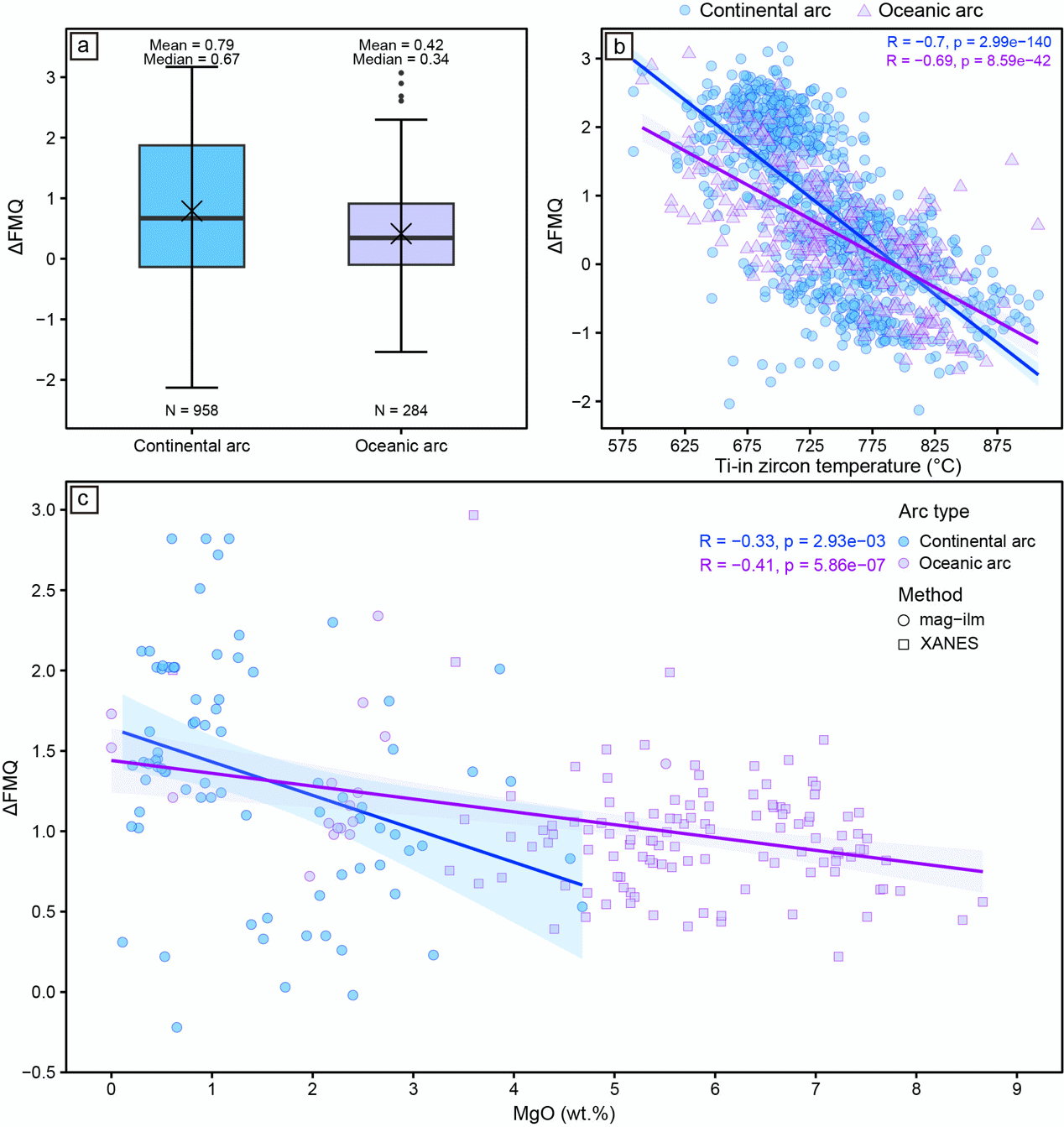图4 基于锆石微量元素的大陆弧(蓝色)和大洋弧(紫色)ΔFMQ对比。(a)基于锆石Ti-Ce-Ui氧逸度计的ΔFMQ箱线图。(b)两种弧型ΔFMQ和锆石中Ti温度的散点图,阴影区域表示95%的置信区间。(c)大陆弧(蓝色)与大洋弧(紫色)火山岩的ΔFMQ与MgO含量散点图