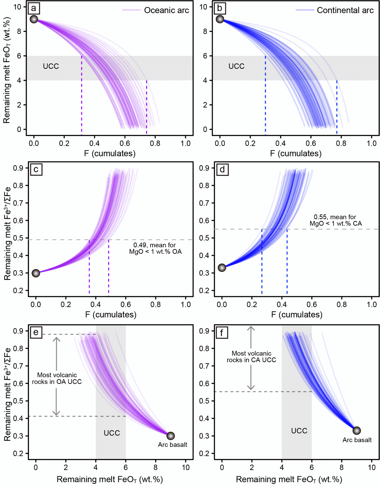 图5 由于弧堆晶体分异作用,大陆弧和大洋弧岩浆Fe亏损(a,b)和氧化(c,d)的蒙特卡罗模拟。(e,f)残余熔体的Fe3+/ΣFe随熔体Fe亏损的变化。每种弧类型有100次模拟,每个堆晶体的矿物比例各不相同。大洋弧的堆晶体的矿物成分为橄榄石-斜方辉石-单斜辉石-尖晶石-角闪石-磁铁矿,大陆弧的堆晶体的矿物成分为橄榄石-斜方辉石-单斜辉石-尖晶石-角闪石-石榴石。(a,b)和(e,f)中的灰色条带表示大陆上地壳(UCC)的平均FeOT含量(2σ)。(a,b)和(c,d)图中垂直的紫色和蓝色虚线分别标记了两种弧中演化程度最高的岩浆(来自图2a)获得大陆上地壳FeOT含量和演化岩浆平均Fe3+/ΣFe值所需的堆晶体分数。(e)和(f)图中灰色虚线分别代表大洋弧和大陆弧上地壳中大部分火山岩经历不同程度分异后的Fe3+/ΣFe比值范围。缩写:CA = 大陆弧,OA = 大洋弧