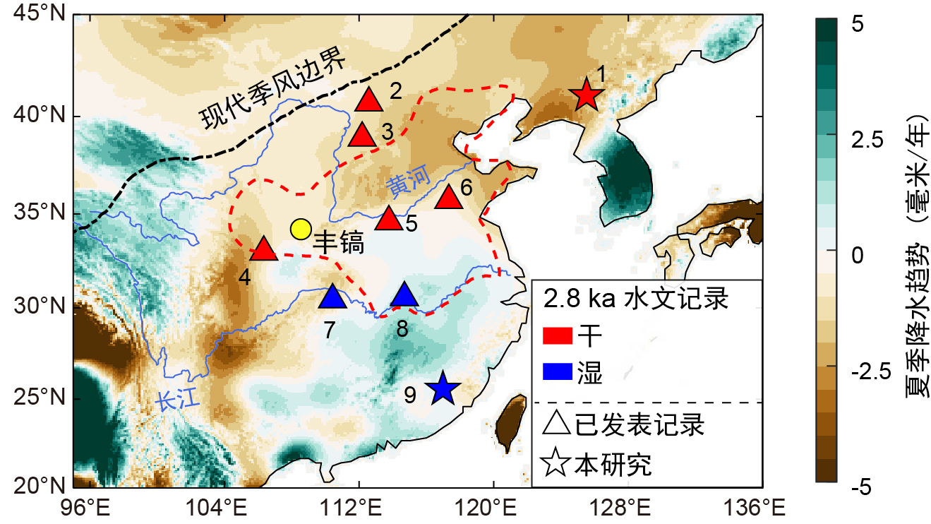 图1 本文提到的水文指标记录点的位置。1—庙洞(本研究),2—岱海湖,3—公海湖,4—祥龙洞,5—河南圃田湖相沉积岩芯,6—梁儿村考古遗址,7—和尚洞,8—江汉平原JH001沉积岩芯,9—仙云洞(本研究)。黄色圆圈表示西周的首都丰镐。红色虚线代表西周控制的最大面积。背景是1950—2010年夏季(6—9月)降水趋势