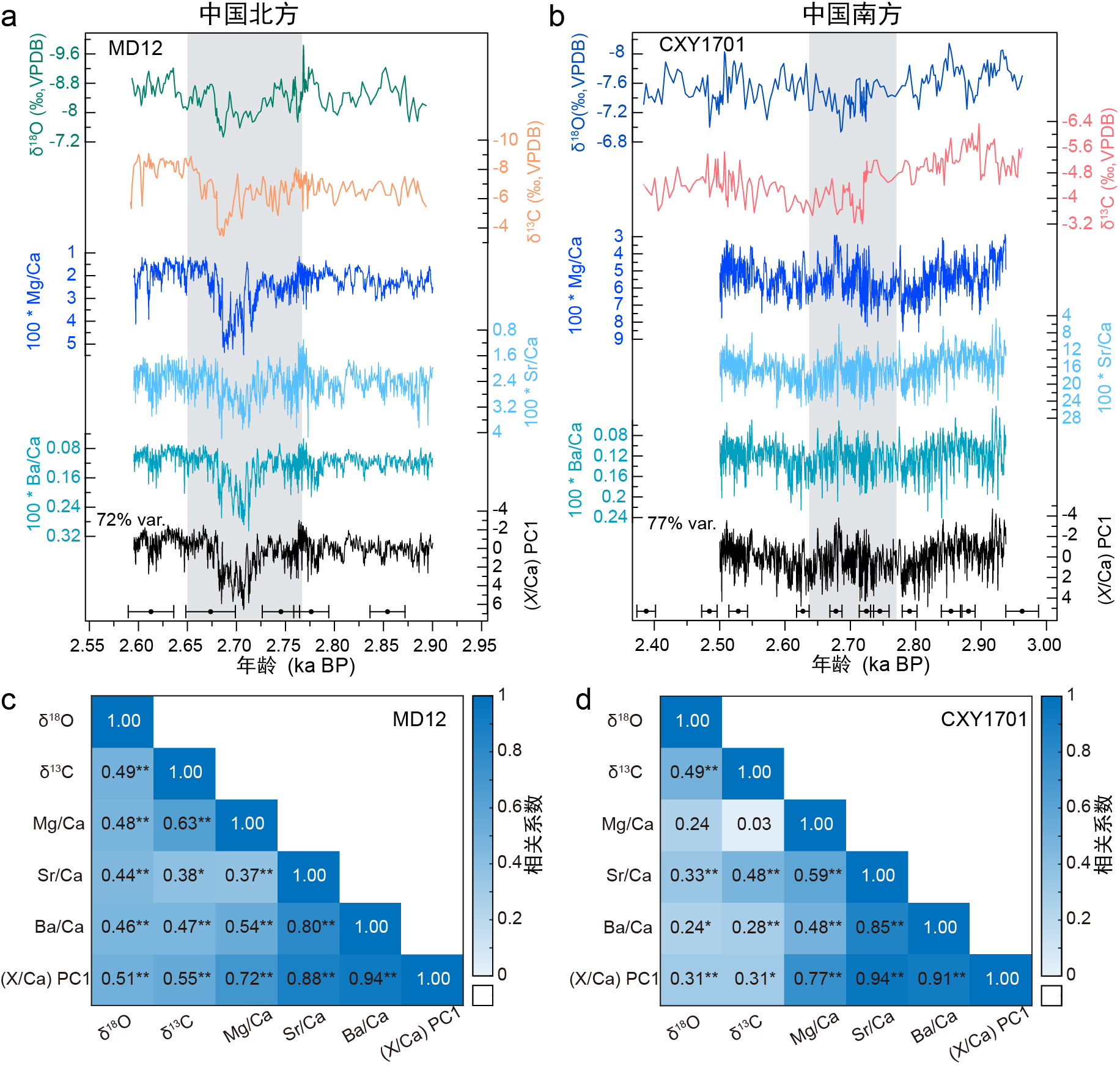 图2 石笋MD12和CXY1701的多指标时间序列及其相关热图。灰色阴影表示2.8 ka事件