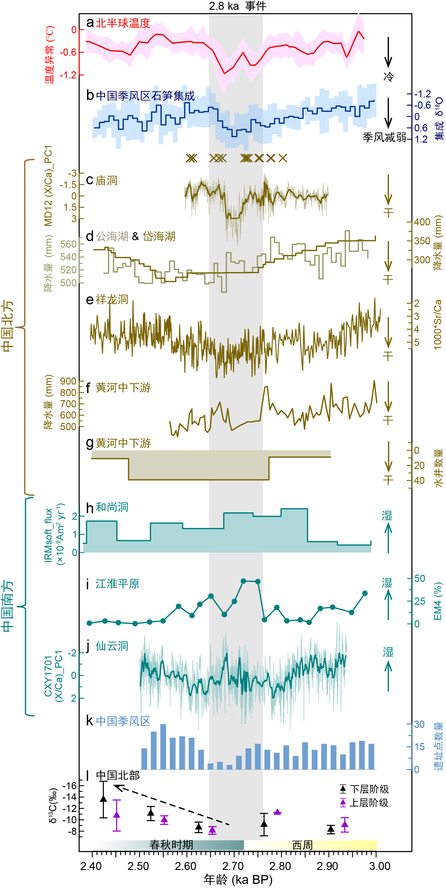 图3 北半球温度、集成石笋δ18O、水文指标记录和考古资料的对比。a. 北半球温度异常记录;b. 中国季风区石笋δ18O记录集成;c. 庙洞石笋MD12微量元素记录的PC1(本研究);d. 公海湖和岱海湖花粉重建的降水;e. 祥龙洞石笋XL16的Sr/Ca记录;f. 黄河中下游圃田湖相沉积物花粉降水重建;g. 黄河中下游地区水井数量;h. 和尚洞石笋HS4的环境磁参数IRMsoft_通量;i. 江汉平原JH001沉积岩芯的粒度端元组分EM4,反映古洪水;j. 石笋CXY1701微量元素记录PC1(本研究);k. 中国季风区考古遗址数量;l. 中国北方不同考古遗址的社会经济地位上、下层人骨的δ13C数据。“×”代表历史文献中记录的干旱事件。灰色阴影表示2.8 ka事件
