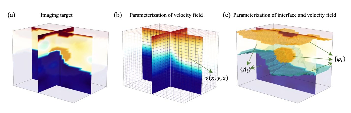 来表达地下介质,其正则化过程在增强数值稳定性的同时,会降低对速度突变界面的精确重建能力; (c) 本文所提出的三维界面参数化方案的成像结果示意。该方法通过水平集方程(