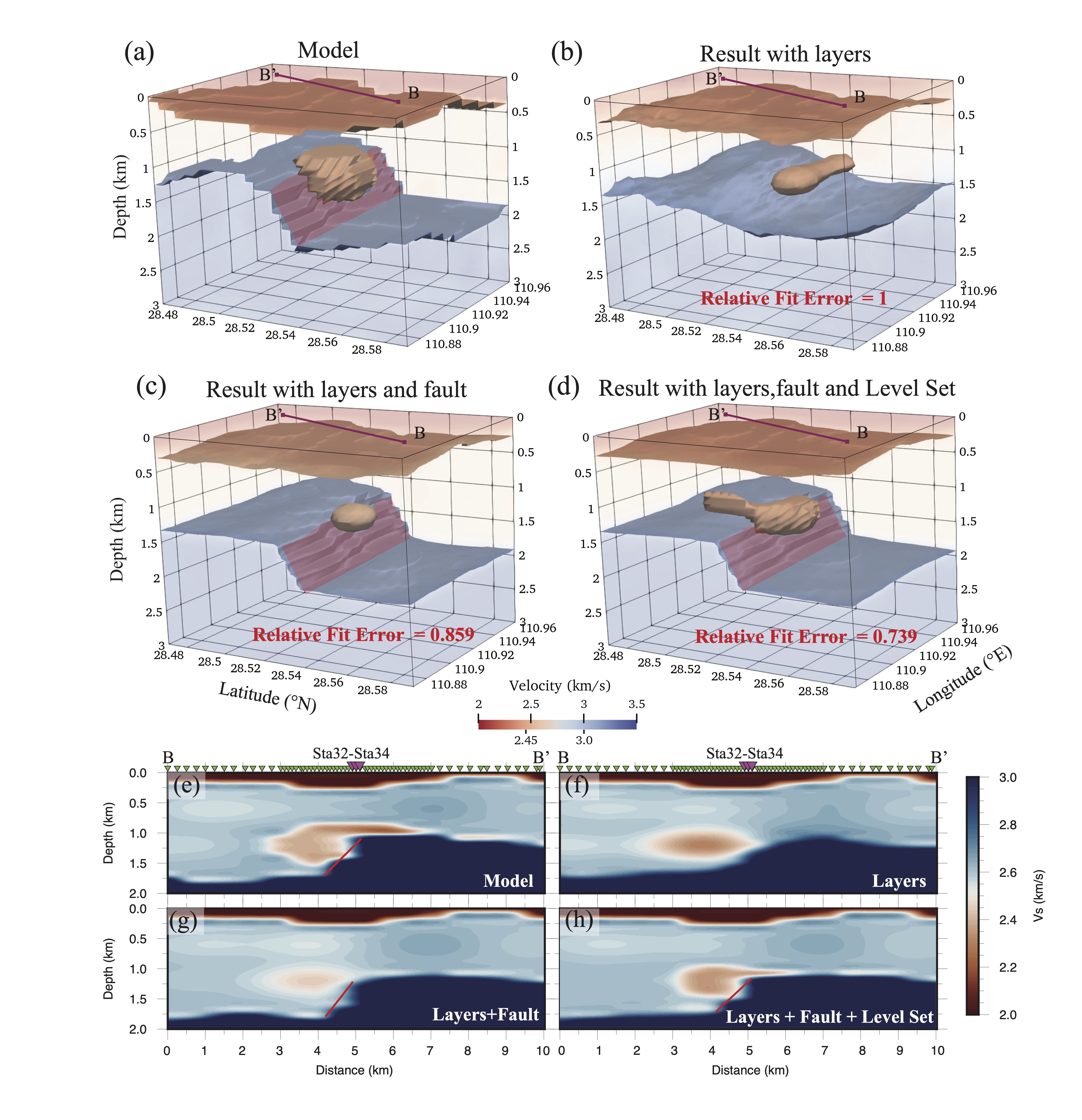 针对上述挑战,中国科学院地质与地球物理研究所博士研究生王雨杰在王新特聘研究员的指导下,联合多位合作者提出了一种地质信息引导的背景噪声层析成像反演框架。该方法采用基于水平集的三维界面参数化策略 (Osher and Sethian,1988;Muir and Tsai,2020),替代传统网格化模型描述方式,能够同时反演三维地质界面几何形态及界面间的不均匀速度结构(图1)。这种“地质驱动”的思路,能够将先验地质信息(如地层数量、断层展布等)作为显式约束,有助于获得更符合地质实际的模型 (Tsai et al.,2023)。研究团队将该方法应用于我国湖南沃溪金矿区的密集台阵实测数据,检验方法的可行性。