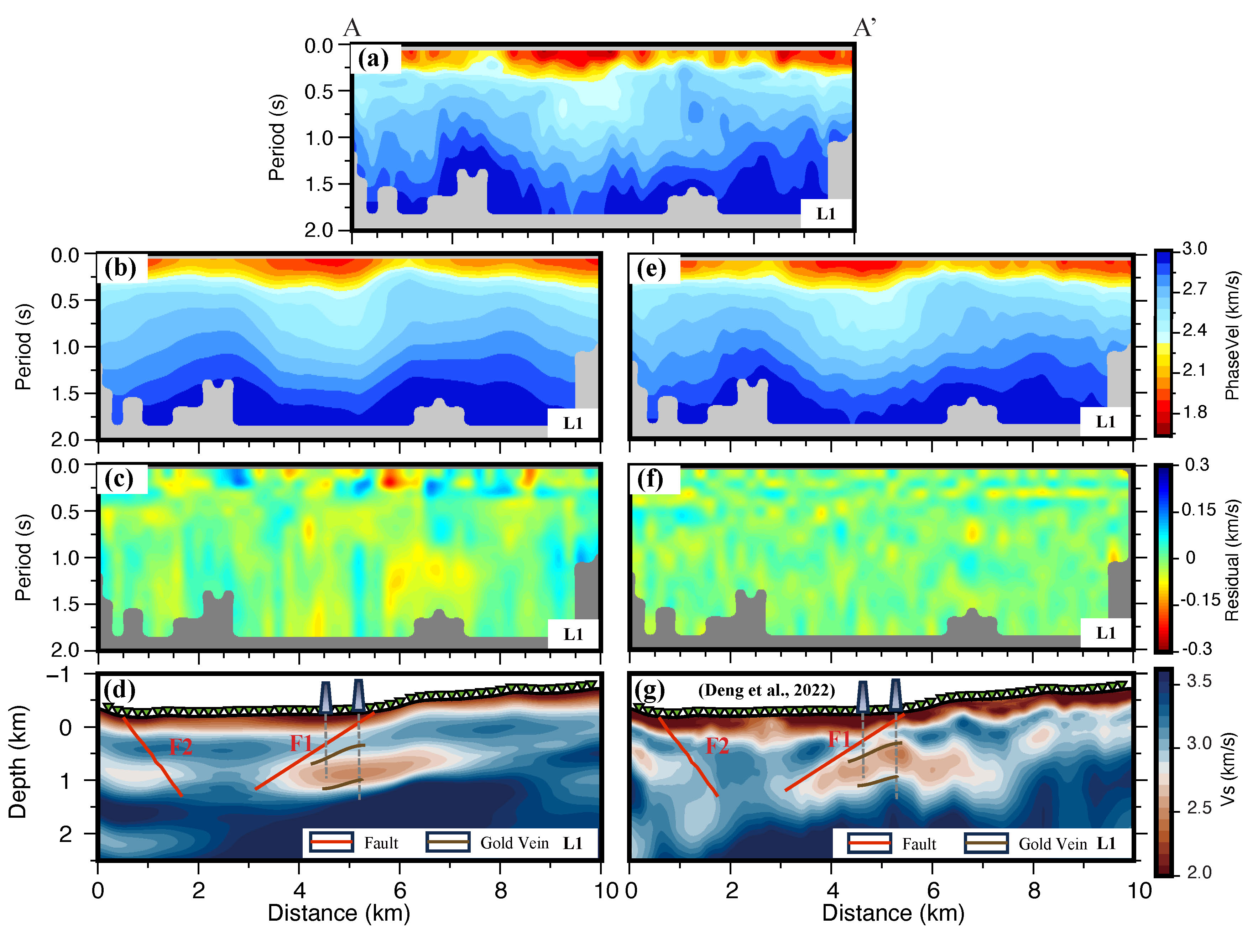 图3 沃溪金矿区L1测线的反演结果与数据拟合残差对比。图a是作为反演输入的观测频散曲线;图b-图d系统展示了水平集方法的结果,依次为:图b基于最终速度模型预测的频散曲线,图c数据拟合残差剖面,以及图d最终获得的速度模型。在图d中,红线、棕色线、绿色三角形和灰色梯形分别代表断层、已验证的金矿脉、地震台站和钻孔位置。作为对比,图e-图g展示了一维反演方法的对应结果,包括图e预测的频散曲线、图f数据拟合残差剖面和图g最终的速度模型(Deng et al.,2022),其余符号与图d中相同