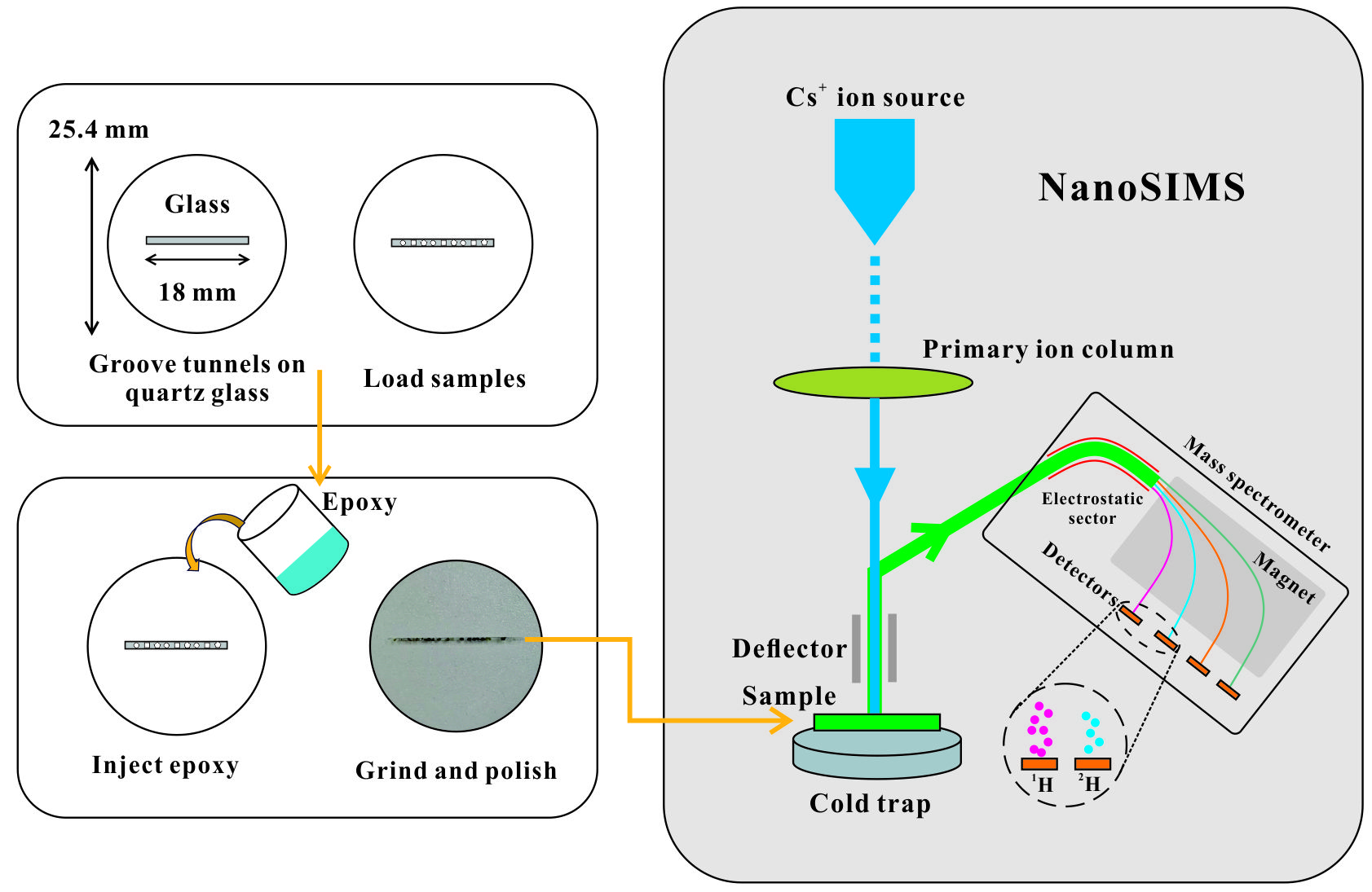 针对此分析技术难题,中国科学院地质与地球物理研究所行星科学与前沿技术重点实验室的博士研究生高宇冰,在我所纳米离子探针实验室(IGGCAS-NanoSIMS lab)郝佳龙高级工程师和胡森研究员的联合指导下,开发了一种新的适用于SIMS测试的制靶方法:采用一英寸石英玻璃片作为基底,利用划片机在其表面刻划一至三条槽,将小颗粒样品压入槽内,随后进行注胶固定及抛光处理(图1)。该方法创新性地通过物理限位替代大量包埋,显著减少了树脂用量。实验证实,当环氧树脂用量控制在0.6 mm³以下时,其对NanoSIMS水分析的氢本底(氢背景值稳定在约8 ppm)、真空度及校正曲线均无显著影响。与此同时,标样的氢、氧同位素测量结果表现出良好的均一性,样品与靶基之间无明显高度差,表明该方法所制备的样品表面平整度良好,满足高精度同位素测量的要求。