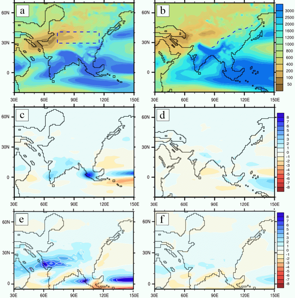 图2 (a-b)模拟的晚始新世(~40 Ma)与早中新世(~20 Ma)东亚地区年降水量(mm year -1);(c-f)标准实验与敏感性实验年降水量差值场(mm day -1):(c) LEOC – LEOC_LCO2, (d) EMIO – EMIO_LCO2, (e) LEOC_126ka – LEOC, (f) LEOC_6ka – LEOC