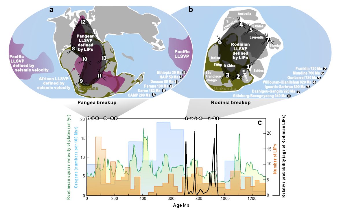 图1 大火成岩省与大低速省和超大陆(a盘古,b罗迪尼亚)的时空关系及其数量与板块运动速率和造山带数量随时代的变化(c)。图中LLSVP为大低速省,LIP为大火成岩省,Pangea和Rodinia分别为潘吉亚/盘古和罗迪尼亚超大陆