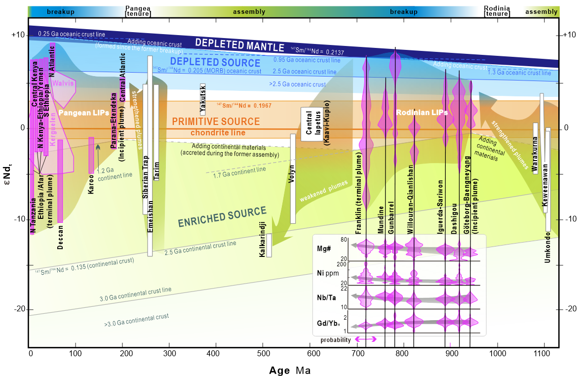 图2 罗迪尼亚与盘古超大陆大火成岩省化学指标变化对比。图中εNdt为经过球粒陨石比值归一化后的某个时间t对应的143Nd/144Nd值的一万倍