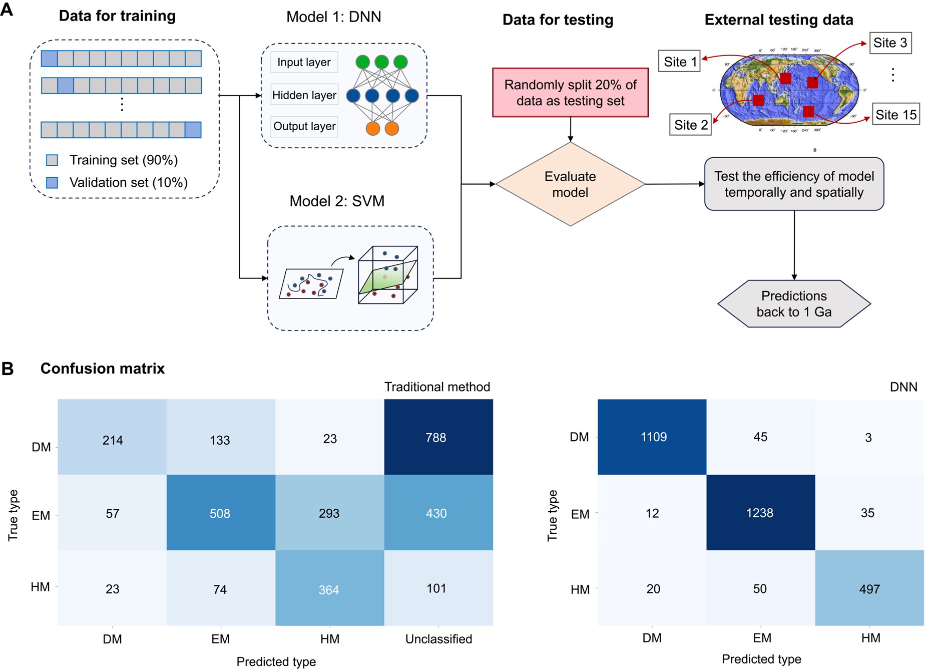 研究团队选取了新生代玄武岩(0-66 Ma)作为训练集,涵盖三种主要地幔源区:DM(亏损地幔源区)、EM(富集地幔源区)以及HM(含水地幔源区)。采用8种机器学习算法进行训练,DNN和SVM模型表现出最优性能(图1A),在测试集上准确率高达95%。在相同的测试集上,传统地球化学方法(以Zr/Nb vs. Nb/Th为例)仅只有36.09%的准确率,这表明机器学习相比传统指标显著提高了地幔源区识别准确率(图1B)。