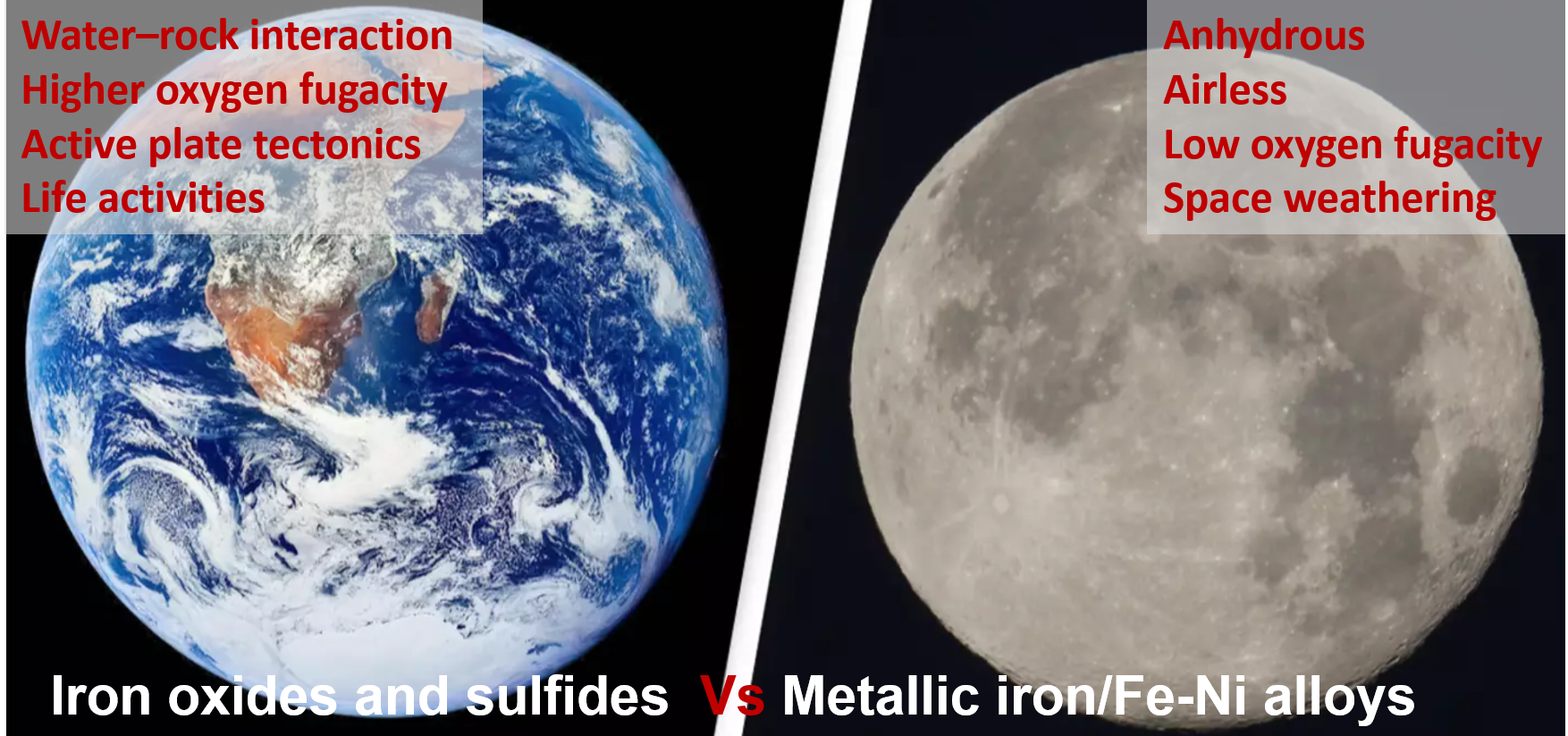月球环境:极度干燥、强还原(氧逸度远低于IW缓冲线),不利于Fe³⁺相稳定,因而金属铁与Fe-Ni合金更常见并主导磁记录。