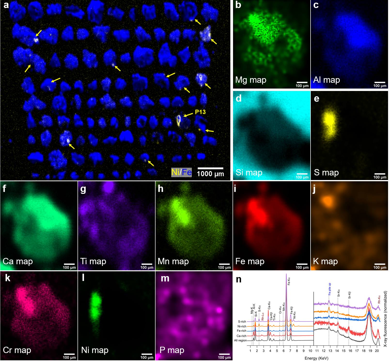 (1)μXRF微区元素普查:在CE5-023样品阵列中识别出多个Fe-Ni-S富集颗粒,选取CE5-023_P13进行深度表征。