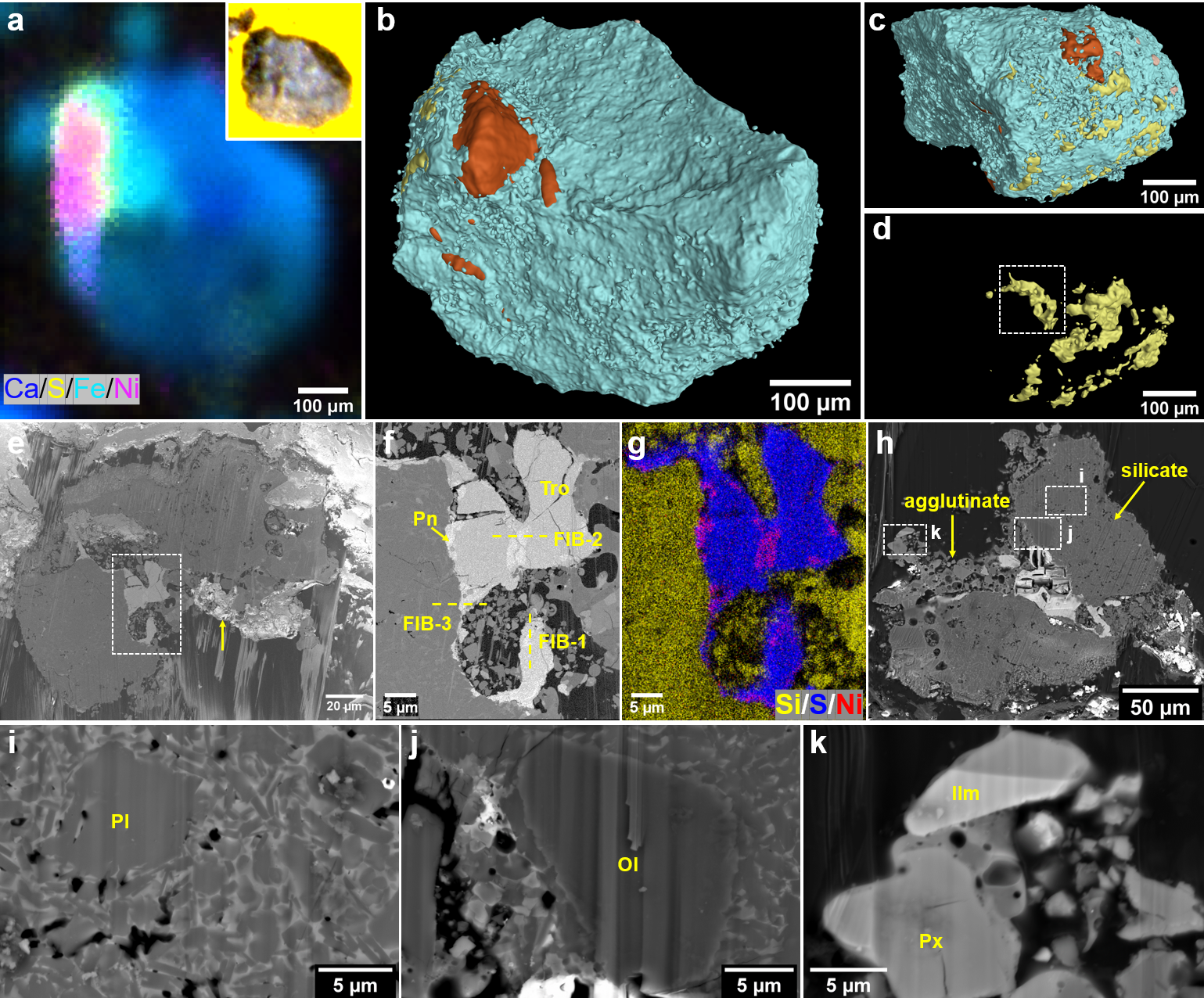 图3 通过关联µXRF(a)、3D-XRM(b-d)和FIB-SEM(e-k)识别CE5-023_P13中的陨硫铁-镍黄铁矿组合。为尽量减少重复电子束曝光可能引起的分析假象,我们分别制备了三个独立的超薄切片,用于(i)矿物学(FIB-1),(ii)化学(FIB-2),和(iii)微磁学分析(FIB-3)