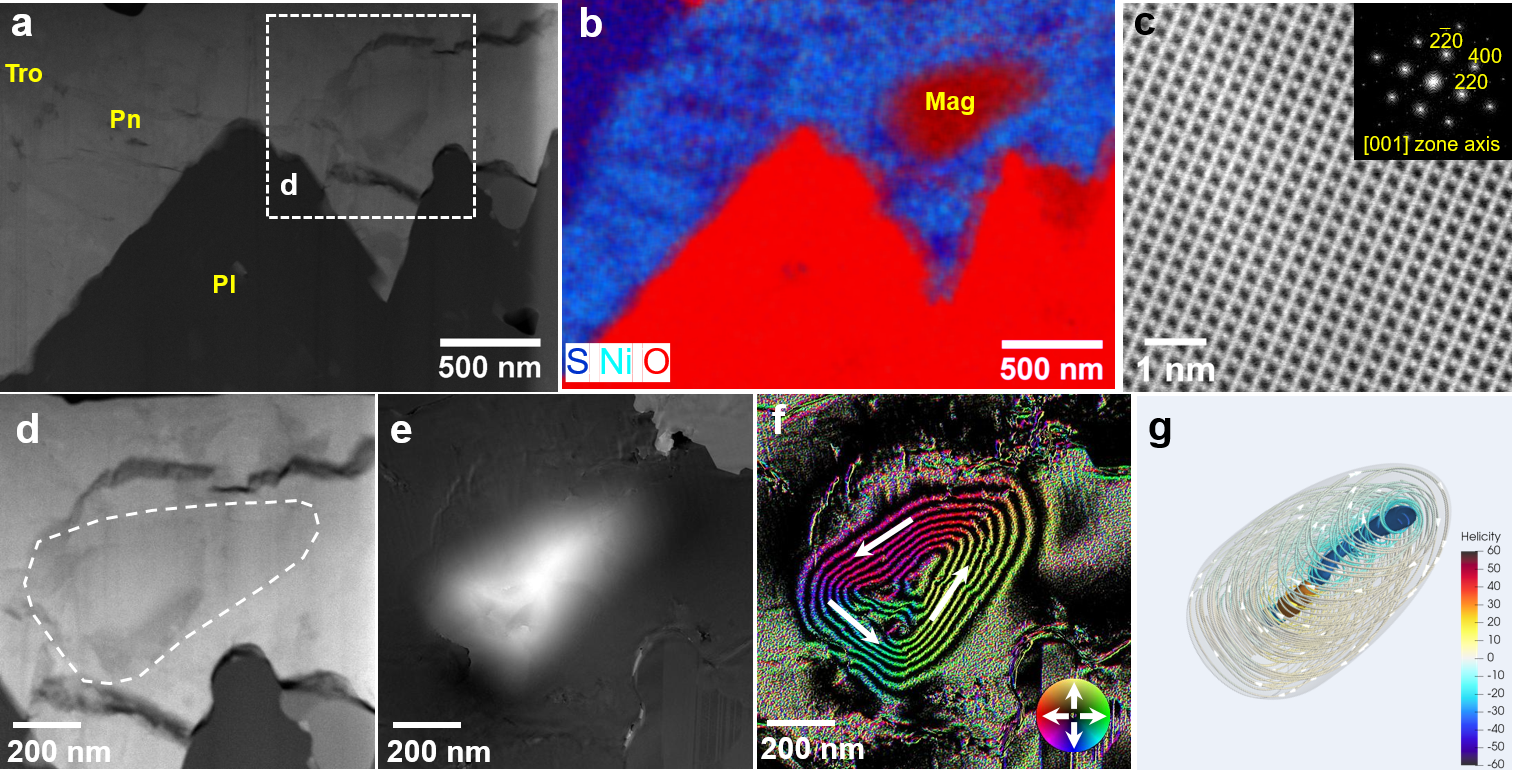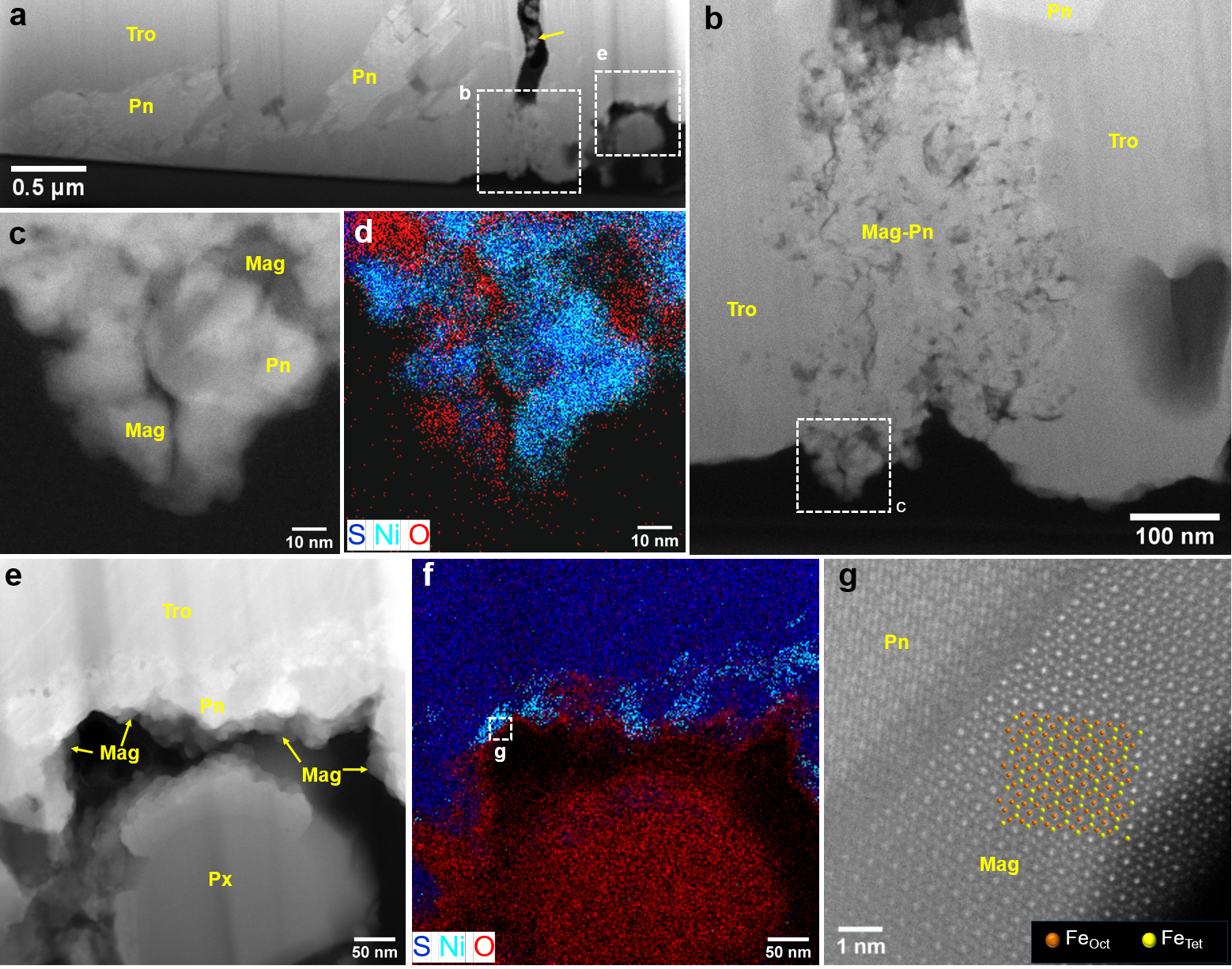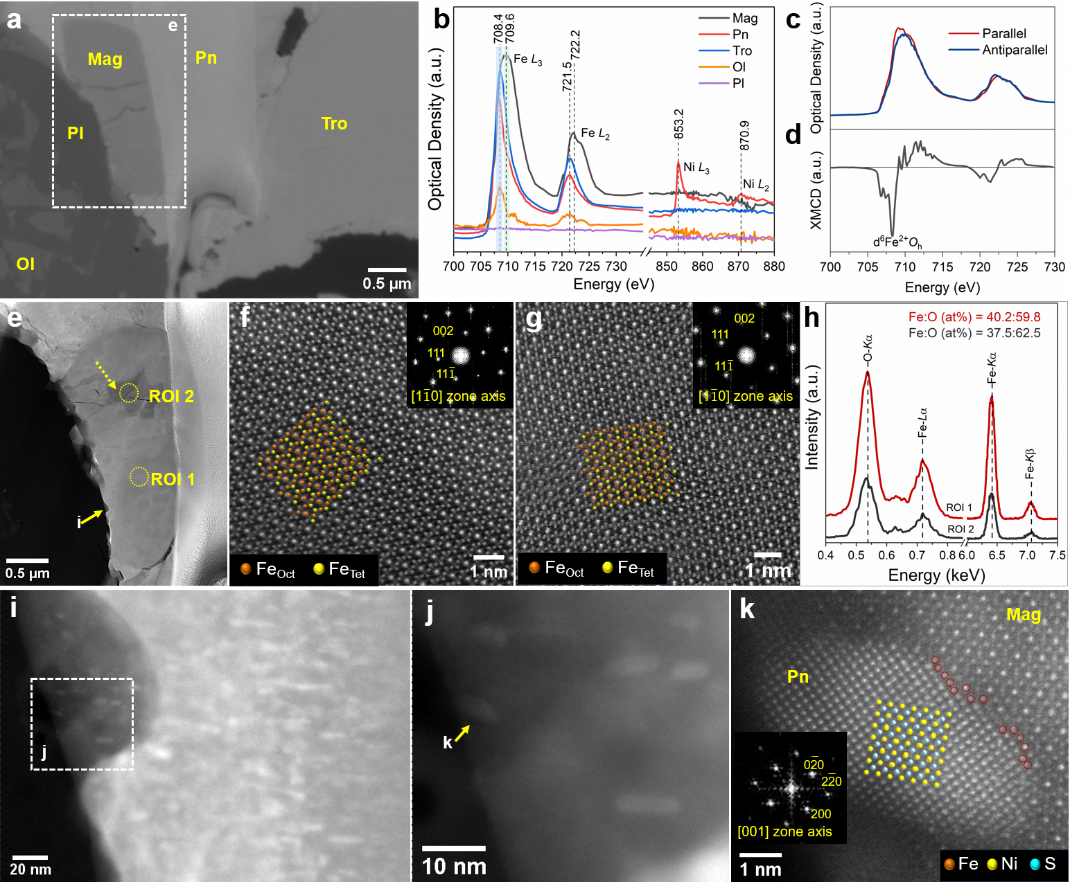 (3)原子分辨率矿物学(HAADF-STEM/EDXS):在纳米-原子尺度明确三相共生:陨硫铁(FeS)-镍黄铁矿( (Fe,Ni)₉S₈)-磁铁矿。显著现象是:(i)磁铁矿优先附着于镍黄铁矿晶界/外缘,多位于硫化物-硅酸盐界面或微裂隙附近;(ii)镍黄铁矿与陨硫铁之间呈共格出溶关系,且陨硫铁晶体缺乏囊泡、含Si包裹体或纳米相金属Fe,表明硫化物相代表了相对原始的物质;(iii)磁铁矿与镍黄铁矿界面存在外延取向,指向界面受控的后期成核与生长。
