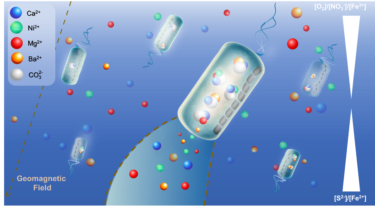 研究发现,趋磁细菌不仅能形成含铁的磁小体,还能在水体金属离子浓度极低的条件下主动富集Ba²⁺与Ni²⁺,形成碳酸盐颗粒。传统方法认为沉积这两类元素主要依赖无机吸附或大颗粒沉淀物的捕获。然而,细胞级别的MTB可在生境中高效富集稀有金属,且因其趋磁性运动特征,可能在氧化–还原过渡带(OATZ)中完成微尺度金属垂直迁移与封存,兼具生态功能与矿物记录价值。其在死后残留的碳酸盐颗粒,也可能成为古环境中Ba/Ni富集的“生物印记”,为地质历史重建提供潜在的新标志物。