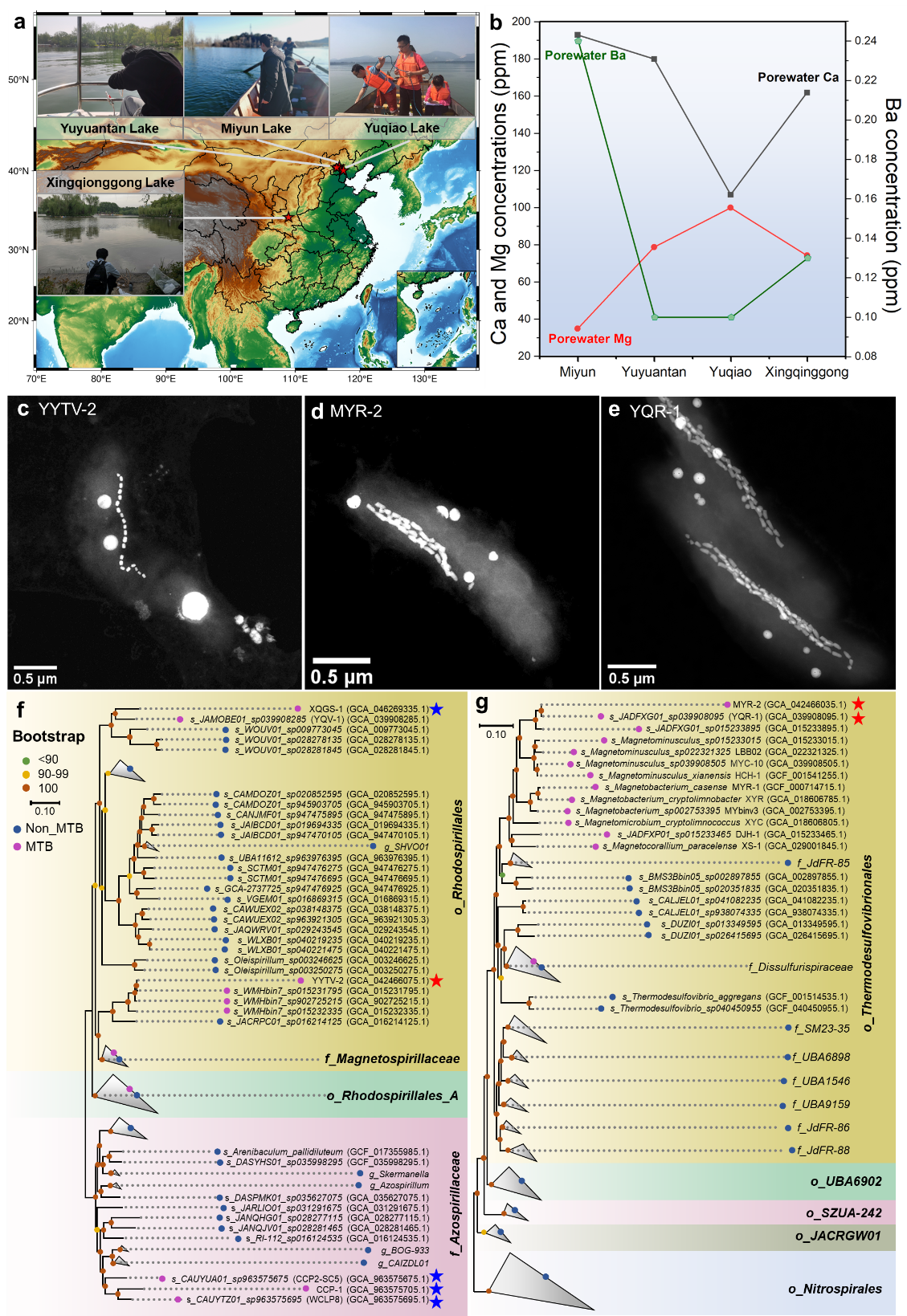 MTB富集发现三株趋磁细菌,分别命名为MYR-2、YQR-1与YYTV-2。TEM观测发现,三种MTB均形成1–7个球形胞内碳酸盐包裹体,其颗粒尺寸约为0.11–0.22 μm,与磁小体链结构共同存在(图2c–图2e)。基因组分析显示其隶属于进化上古老起源的硝化螺旋菌门与假单胞菌门(图2f–图2g)。这是首次在假单胞菌门之外发现胞内钙化的MTB。