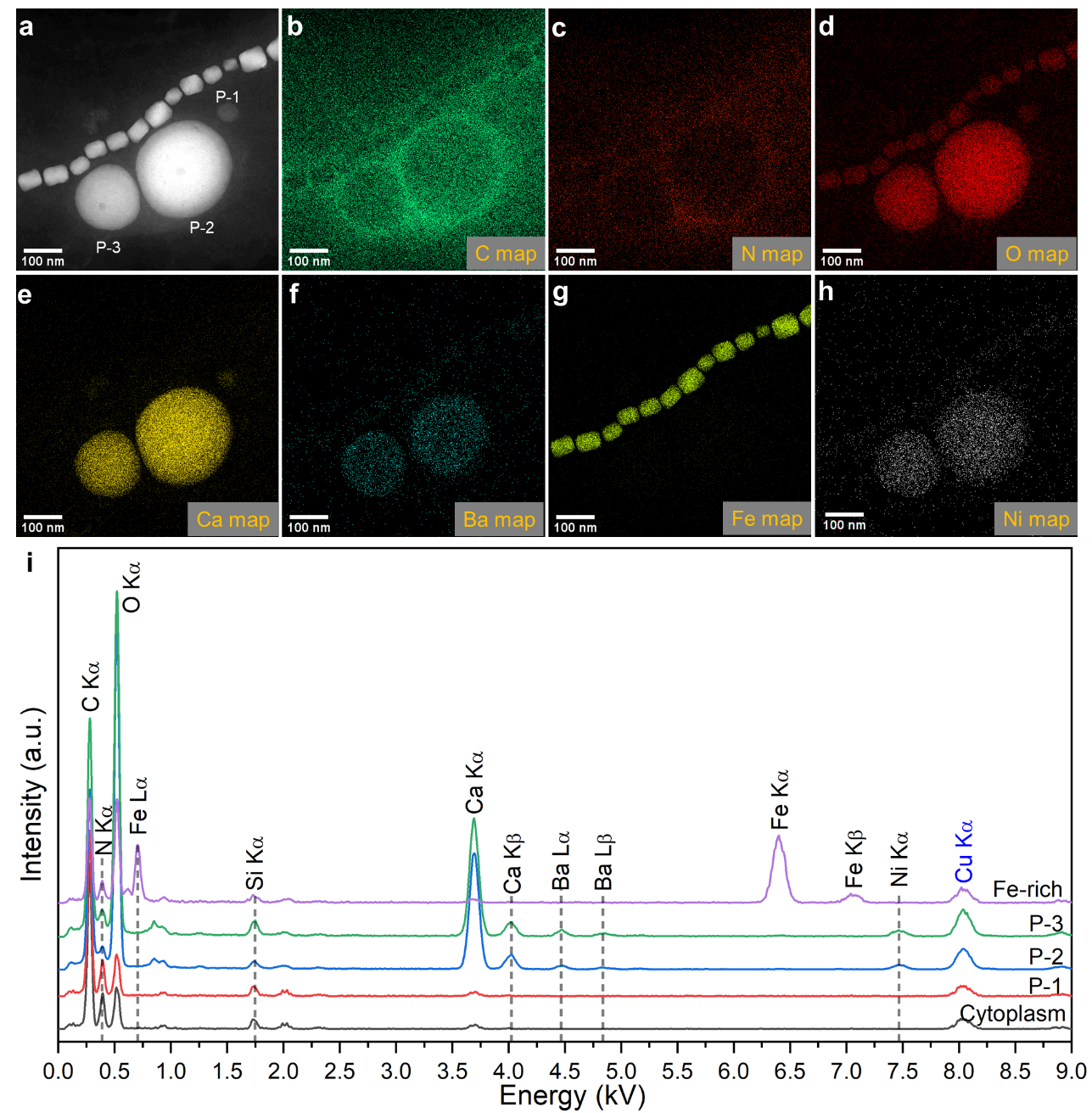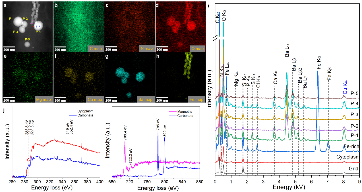 更重要的是,在STEM-EDXS中观察到Ba/Ca比值最高达20.4,平均值在MYR-2细胞中为6.92 ± 1.65,在YQR-1细胞中为8.37 ± 7.4,而在YYTV-2细胞中显著较低(0.05 ± 0.04),进一步佐证了该类MTB具备选择性离子浓缩能力,表现出典型的细胞控制矿化特征。