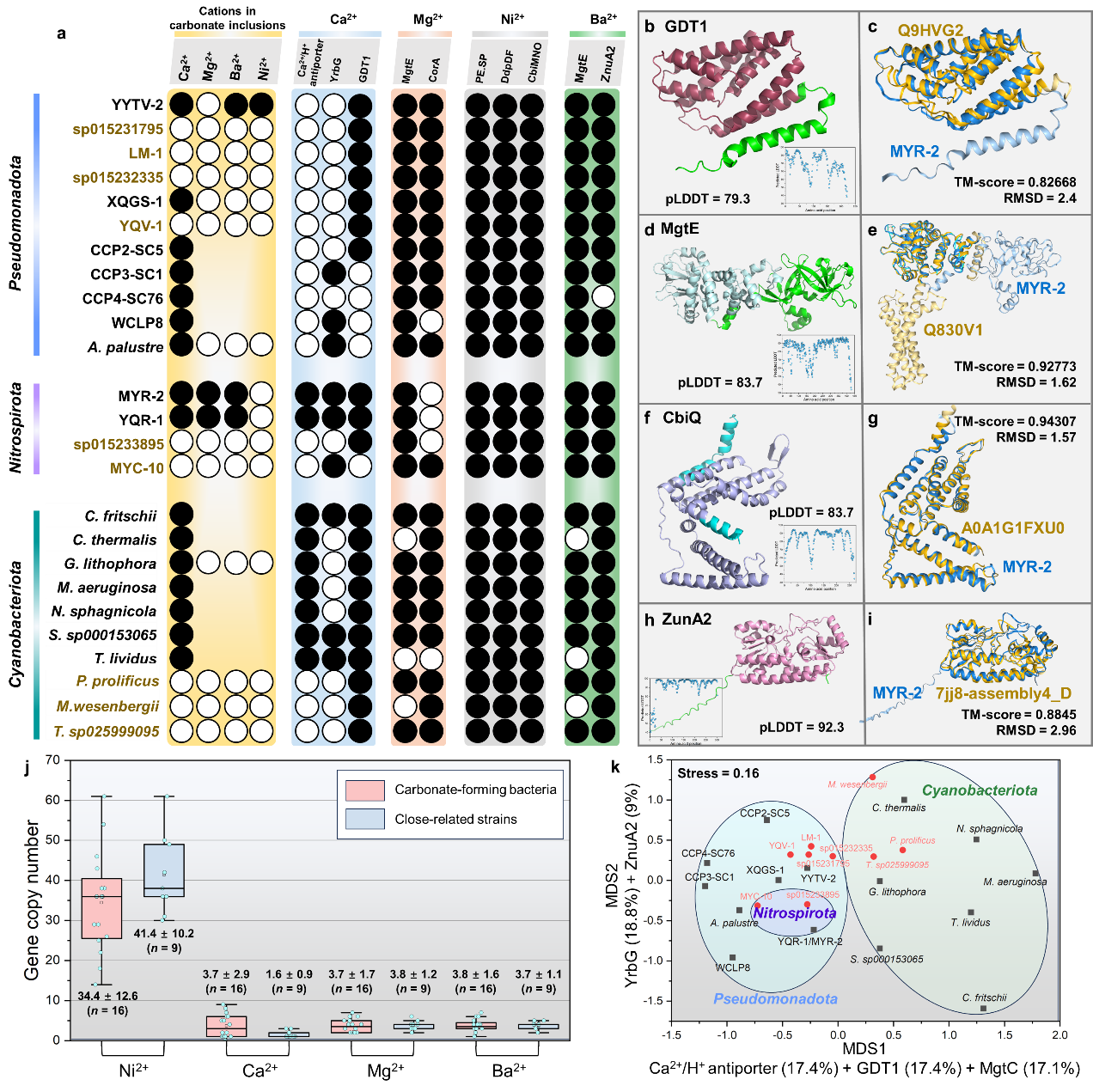 蛋白三维结构建模显示,上述通道蛋白均具备经典金属结合域(如TroA-like, GDT1, MgtE),且与已知金属通道蛋白结构三维结构高度一致(TM-score > 0.82;RMSD < 3)。(图5b–图5i)。生物统计学分析表明,碳酸盐矿化MTB中GDT1与Ca²⁺/H⁺反转运蛋白的拷贝数显著高于非矿化菌,支持其参与离子调控的功能假说(图5j–图5k)。