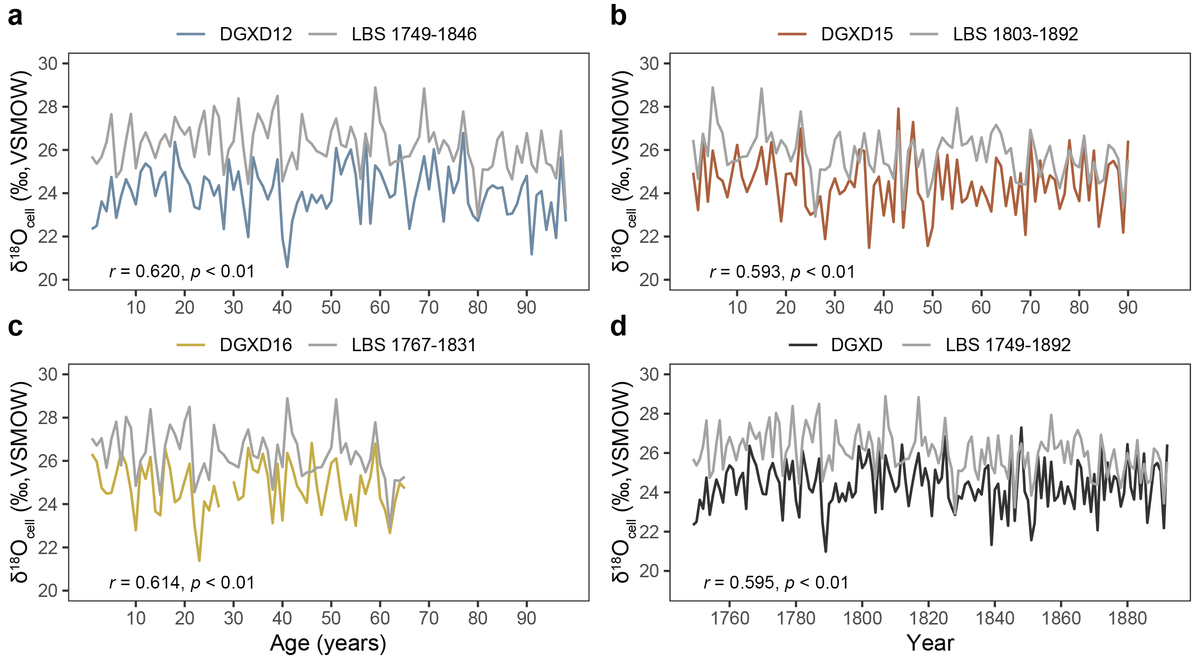 另外,木构件样品树轮氧同位素浮动年表与东北老白山主年表高度相关,表明它们记录着共同的气候信号和地理来源。这意味着这3处木构件原木材可能取自我国东北地区。