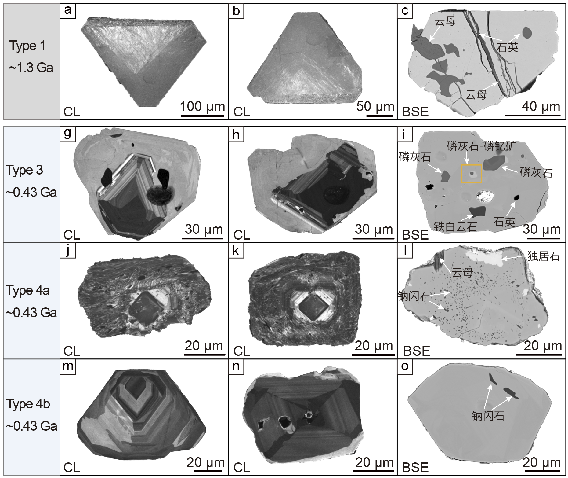 图1 白云鄂博矿床中元古代(Type1)和早古生代(Type3和4)两期碳酸岩岩浆锆石形态结构特征