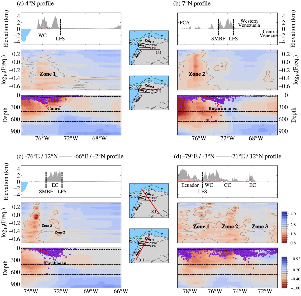 中国科学院地质与地球物理研究所行星科学与前沿技术重点实验室地震学学科组的博士研究生刘真、导师赵连锋研究员、美国加州大学圣克鲁兹分校的谢小碧研究员、哥伦比亚国立大学的Carlos A. Vargas教授与其他合作者一起,利用哥伦比亚及邻近区域布设的高密度地震台阵观测数据,采用单双台联合反演方法,构建了高分辨率(~1°×1°)的宽频带 (0.05–10.0 Hz) 地壳Lg波Q值模型(图2),揭示了板块俯冲系统之下的地壳热异常分布,并据此推测了隐没三联点的可能位置。