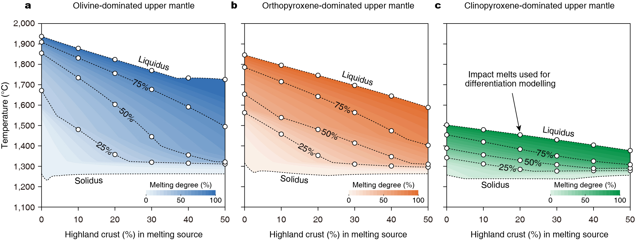 图2 撞击熔融模拟。(a)橄榄石主导的上月幔;(b)斜方辉石主导的上月幔;(c)单斜辉石主导的上月幔