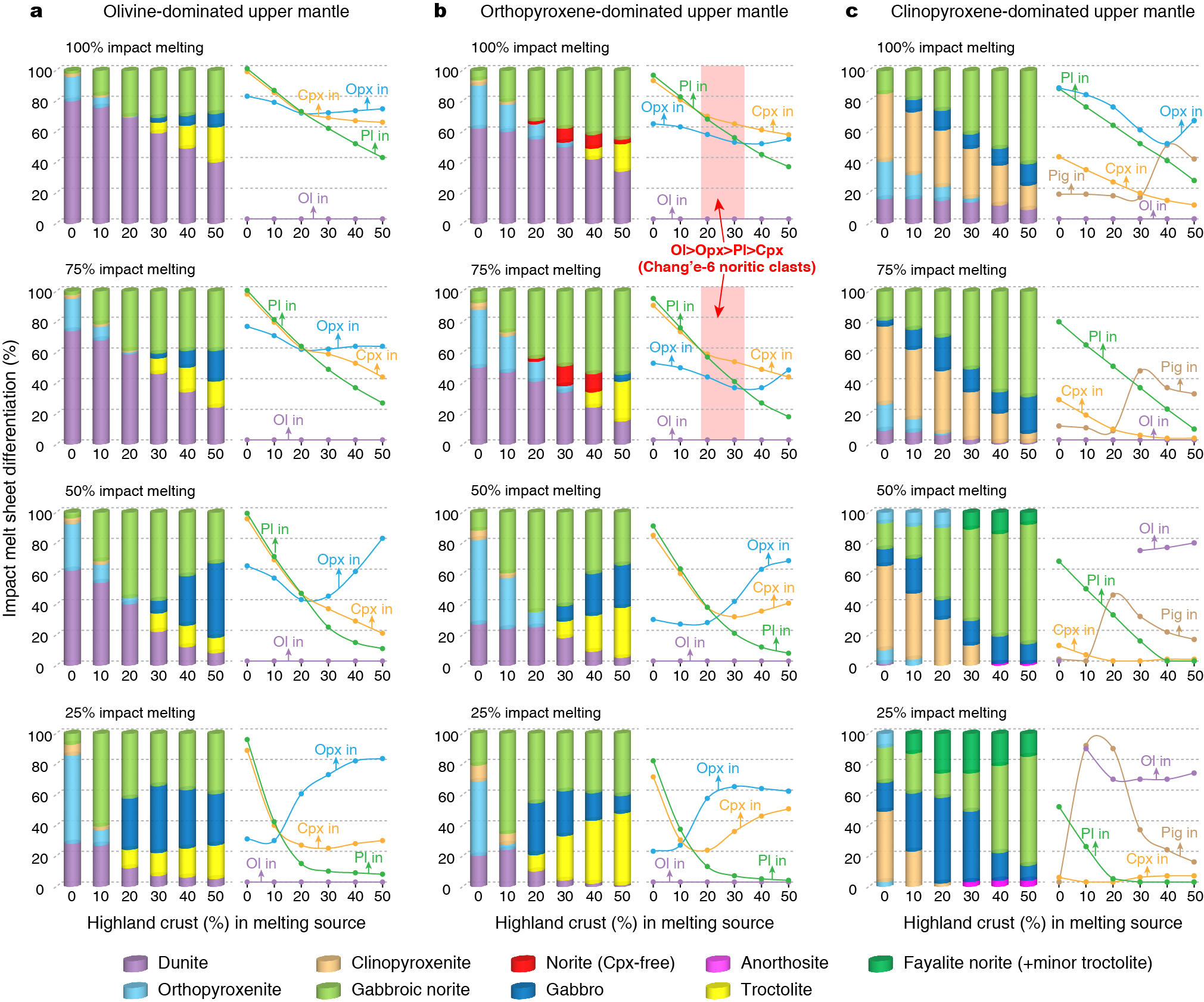 通过对苏长岩进行详细的岩相学分析,团队发现SPA撞击岩浆池的结晶顺序为:橄榄石→斜方辉石→斜长石→单斜辉石,这与月球岩浆洋的结晶序列高度相似,为后续岩石学模拟验证提供了关键约束条件(图1)。为还原SPA撞击熔融过程,团队构建了橄榄石、斜方辉石和单斜辉石主导的三种上月幔成分模型,通过热力学方法模拟了不同上月幔成分与斜长岩月壳的混合及熔融过程(图2),随后又模拟了撞击岩浆池结晶分异过程(图3)。