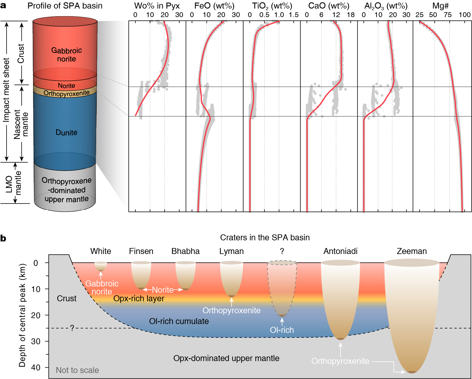 该研究揭示,SPA撞击导致了显著的壳幔重组。SPA盆地内部的斜方辉石富集区来源复杂:既可能直接来自上月幔,也可能是岩浆池结晶的产物。例如,盆地内较小的撞击坑(如挖掘深度约13公里Lyman坑)中央峰暴露的斜方辉石岩大概率来自岩浆池的结晶;而较大的撞击坑(如深约30公里的Antoniadi坑和深约42公里的Zeeman坑)则可能直接挖掘出了斜方辉石主导的上月幔。研究还预测,在SPA盆地中心约20–30公里深度的撞击坑中央峰或存在纯橄岩,这为未来月球探测提供了明确目标。