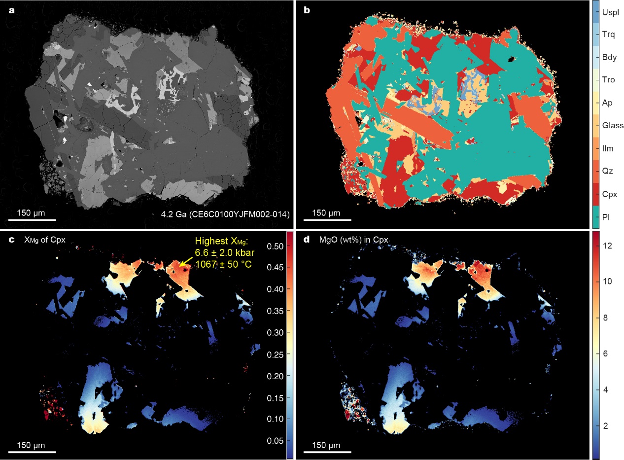 最近,中国科学院地质与地球物理研究所月球研究团队对嫦娥六号月壤样品中喷发于42亿年前的高铝玄武岩(图1)开展系统研究。该高铝玄武岩岩屑主要由斜长石、单斜辉石、石英、富钾玻璃、钛铁尖晶石和钛铁矿组成,并含有少量陨硫铁、磷灰石、斜锆石及静海石(图 1b)。团队采用多种温压计算方法,联合限定核部高镁单斜辉石(XMg = 0.45)的形成条件为6.6 ± 2 kbar和1070 ± 50°C,鉴于高铝玄武岩中斜长石结晶早于单斜辉石,因此其源区深度应该不低于120 km。