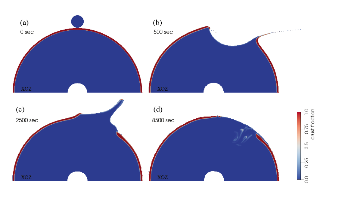 为进一步分析深部月壳物质迁移过程,团队采用CitcomS软件模拟后续的月球内部对流过程,发现由撞击诱发的热异常和化学异常触发了位于SPA盆地内环下方的强烈上涌对流,从而导致深部月壳物质随月幔一起上涌迁移,熔融月壳在30–200 km月幔深度可持续存在长达150百万年,这一动力学过程可以形成高铝玄武岩的混合型月幔源区。