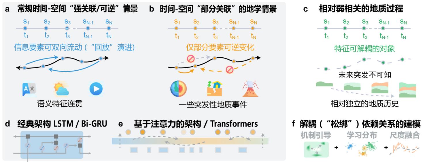 图1 对比常规数据与特殊地质数据的建模思想。a.展示了常规时空“强关联/可逆”情景,其中信息元素可双向流动(“回放”演进),适用于语义特征连贯的场景;b.描述了时间-空间“部分关联”的地质情景,其中仅部分要素可逆变化;c.针对相对弱相关的地质过程,特征可解耦的对象,未来突发不可控,地质历史相对独立;d-e.分别展示了经典机器学习架构(LSTM/BiGRU)和基于注意力的架构(Transformers)的应用,这些模型假设强耦合和可逆性,适用于文本、天气模式和视频等相干序列;f.定义了本研究框架,该框架在沉积地质情景中解耦依赖关系,结合约束引导、学习分布、尺度融合方法,以提高大区域建模和泛化准确性
