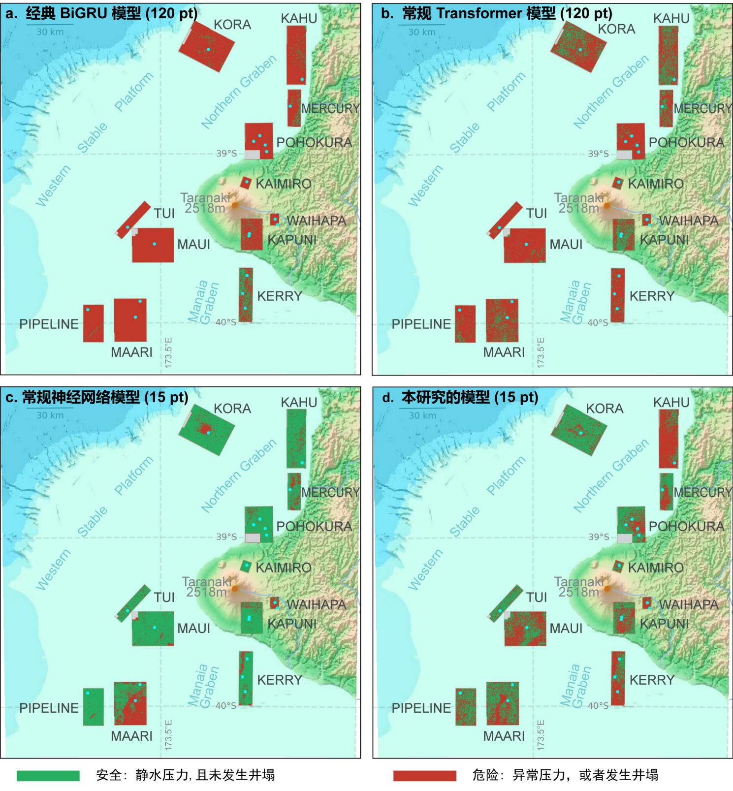 图2 新西兰Taranaki盆地钻探地质风险预测结果对比。经典BiGRU(a)与常规Transformer(b)模型空间泛化能力受限且呈现过拟合,常规神经网络模型(c)则对风险缺乏敏感性;相比之下,该研究模型(d)有效捕捉了地质风险空间趋势,准确识别内陆风险增强区并清晰圈定离岸安全地带。图幅覆盖面积约57,000平方公里,真实钻探风险呈现从海洋向陆地递增(红色增强)的分布规律,预测结果经4口独立测试井验证