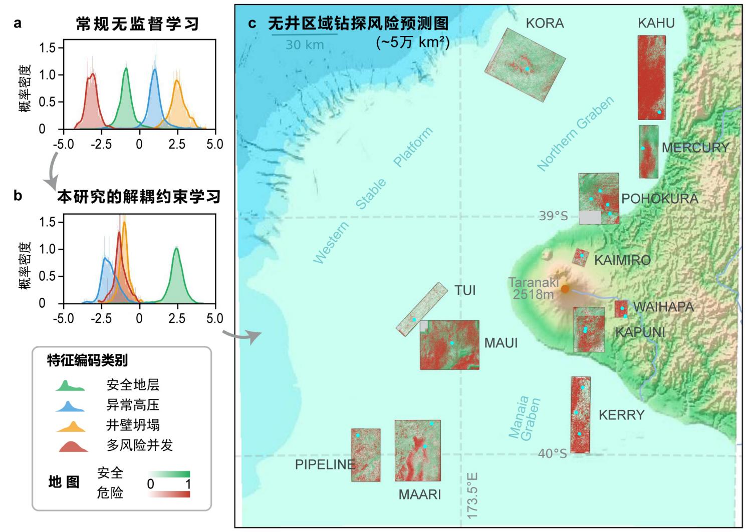 图3 钻探地质风险图及不确定性评估。(a) 采用传统无监督学习生成的地质风险类别嵌入,展示了安全(正常)、超压、井塌及复合风险等类别的似然分布;(b) 该研究方案的风险嵌入,体现出风险类别更优的、符合地质常识的可分离特性;(c) 为基于 (b) 的概率密度函数生成的大尺度风险预测图(约57,000 km²)。风险类别采用颜色编码:安全(绿色)、超压(青色)、井塌(橙色)、复合风险(红色)。注: KAPUNI工区的不连续性源于原始数据的质量问题