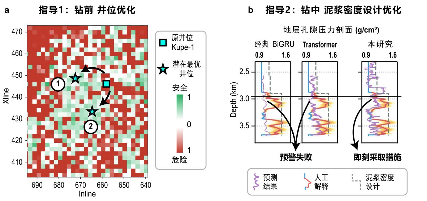 图4 本研究预测结果的工程指导价值分析。(a) 钻井前井位优化:本研究通过风险评估识别安全钻井位置,星号标示潜在优化位置,远离红色标记的高风险区;(b) 钻井液密度设计:BiGRU与Transformer模型预测的地层压力剖面未能提供有效预警,而本研究所得剖面准确预判了需立即采取措施的时机,体现了其在实时钻井作业中的实用性