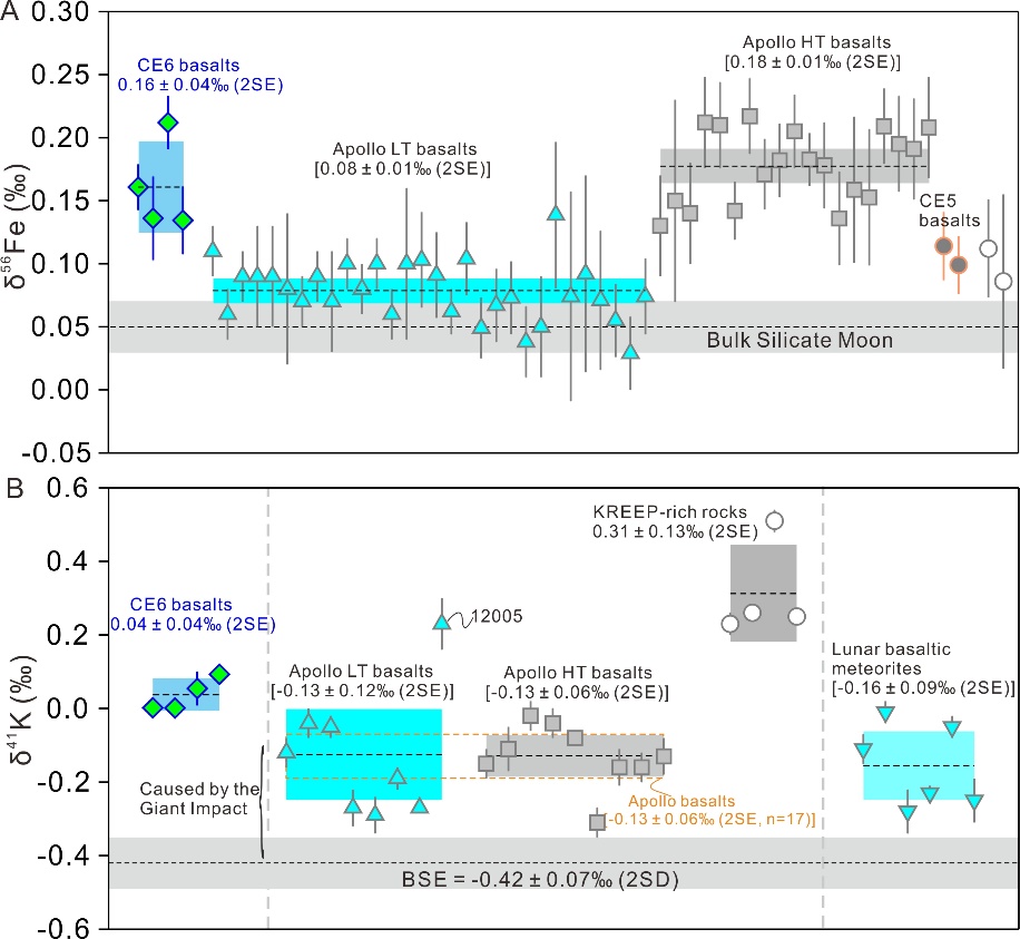 研究团队运用超低消耗量分析技术获取了这四件样品的主量和微量元素数据。结果与已报道的嫦娥六号低钛玄武岩成分相似,既验证了本研究所用分析技术的准确性和可靠性,也进一步确认所研究样品属于28亿年低钛玄武岩。之后,团队采用基于碰撞反应池多接收等离子体质谱仪(CC-MC-ICPMS)建立的高精度Fe、K同位素分析技术,测得玄武岩的δ56Fe为0.13 ± 0.03‰ ~ 0.21 ± 0.02‰(2SD),δ41K为0.001 ± 0.028‰ ~ 0.093 ± 0.014‰(图2)。对比显示,其Fe同位素组成较所有已知低钛玄武岩(包括阿波罗、嫦娥五号样品及陨石)偏重约0.08‰,而K同位素组成也比所有已报道的阿波罗玄武岩重约0.16‰(图2)。