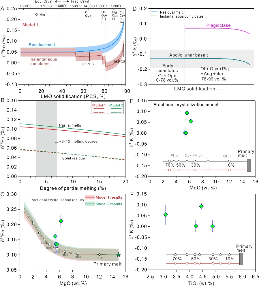 (2)针对嫦娥六号玄武岩中偏重的Fe和K同位素组成,研究团队首先评估了宇宙射线照射对两者同位素的影响,计算表明其贡献微乎其微。随后,团队对岩浆洋分异、部分熔融及分离结晶等过程进行了详细的Fe和K同位素模拟,结果显示岩浆过程能够解释Fe同位素特征,但远不足以解释偏重的K同位素组成(图3)。因此,需有额外的机制来解释K同位素偏重现象,或认为其反映了月球背面K同位素固有的不均一性。