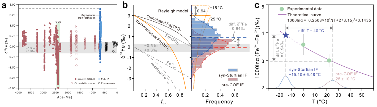 图1(a)地球历史时期铁建造的铁同位素值分布;(b)铁建造形成过程的铁同位素瑞利分馏模型及其雪球时期铁建造和大氧化事件前铁建造的δ56Fe值的相对频率分布;(c)基于铁同位素分馏的温度依赖效应推算,雪球地球卤水温度可低至 –15 ± 7℃
