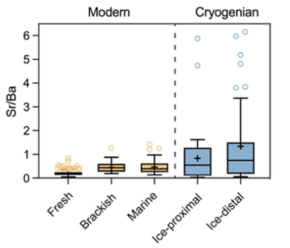 图2 雪球时期盐度指标(Sr/Ba比值)与现代海水的对比