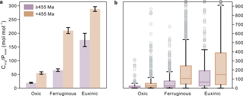 分析结果表明,在4.55至4.45亿年前,海相碎屑沉积物中的Corg/Ptotal出现显著升高,并且这一变化在不同氧化还原环境下均一致存在(图2)。自助法重采样分析显示,455 Ma之后的Corg/Ptotal均值几乎为此前的三倍(图3),分别为207.11±1.60 mol·mol⁻¹ 和 75.66±1.84 mol·mol⁻¹(1 SD)。
