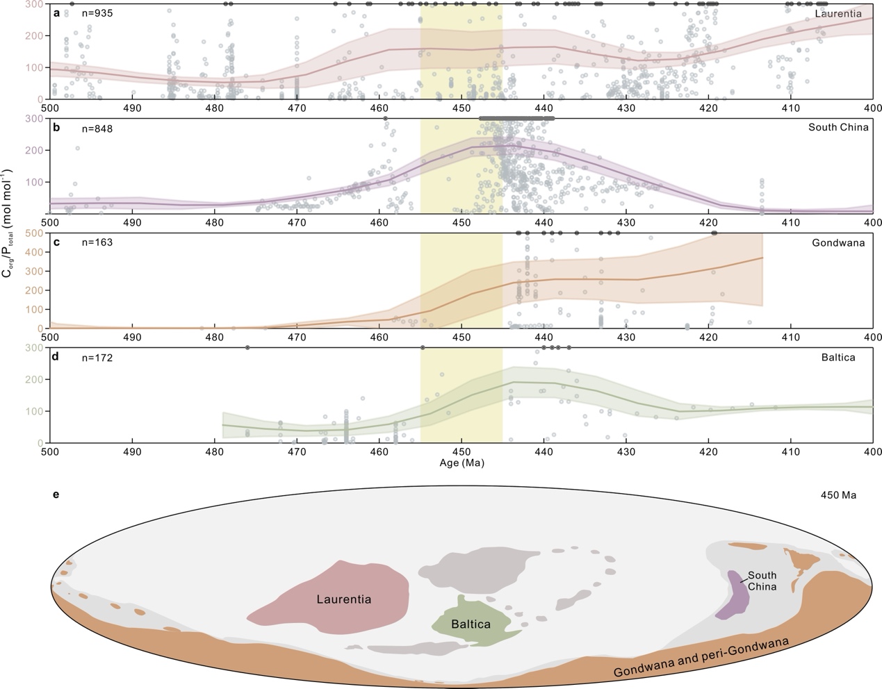 按古陆对数据进行分组分析发现,相较于华南、冈瓦纳和波罗的海古陆,劳伦古陆的Corg/Ptotal升高更早,其上升发生在~4.6亿年前(图4)。这一差异反映早期陆地植物的扩张可能起始于劳伦古陆。